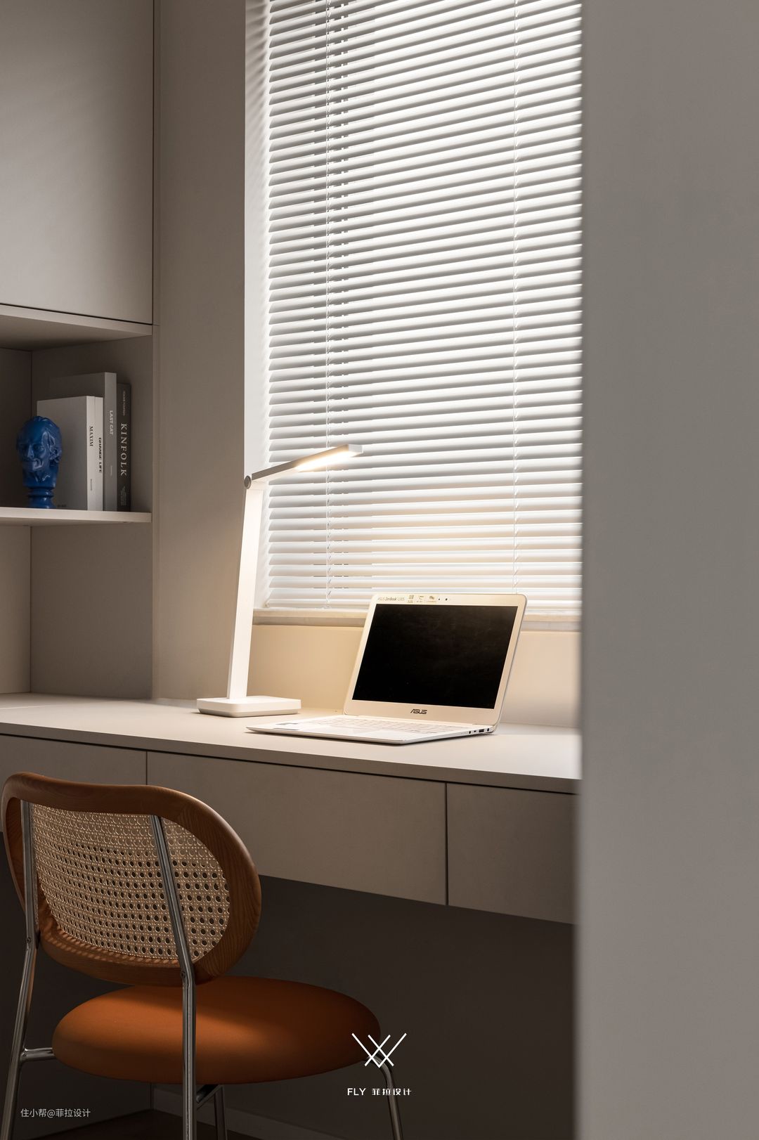 说是书房,也是一个多功能房,为了保证南北通透,这个房间平日里就作为书房使用,房门做的是玻璃移门,平日里就打开,让整个公共空间从南到北 光与气在自然流动。 这个空间里还放了一张沙发床,有亲友客人来访的话就是临时用房,父母来照顾孩子也有住的地方。 在沙发上面做了一排吊柜,以及书桌也是做的抽屉柜,尽可能地增强每个空间的收纳能力。