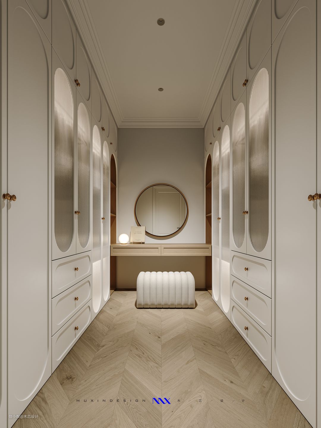 【充足储物,浪漫雅致】 奶油白的长虹玻璃衣帽收纳柜,充足的储物空间,既有现代简约的空间空灵感,又有法式风格的浪漫雅致格调。 【干净简约,方便打扫】 不做吊顶压低层高,选择整面到顶的设计,搭配金色把手拉手轻奢感十足,到顶设计也不易藏灰,方便日常卫生打扫。
