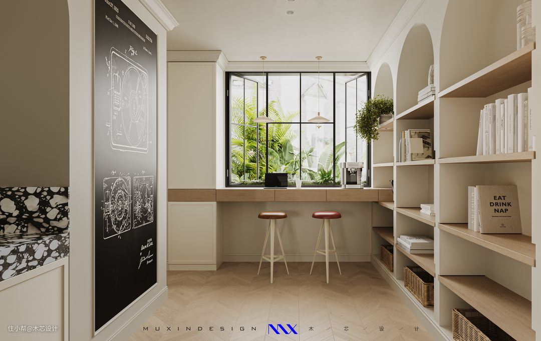 【休闲舒适,自然温馨】 一眼沦陷的法式精致,法式拱形开放格书架+悬浮式书桌一体,温柔的奶油色系和窗外的蕉叶相呼应,如同画廊里的艺术作品,细腻且有趣意。 没有繁复的设计,如同一股清泉缓缓流淌至心尖,感受材质、色彩、肌理和纹样的魅力。