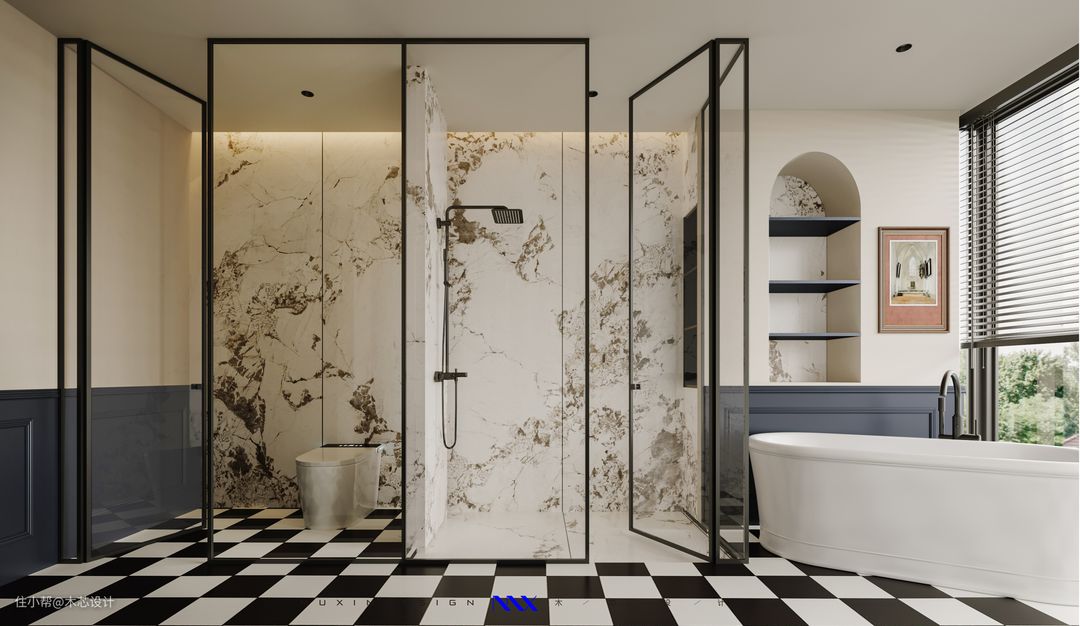 【干湿分区,清爽舒适】 干湿三分离设计,让整体空间干爽舒服,复古的黑白棋盘格地砖,精致的大理石纹墙砖,藏蓝色地柜把法式的精致提炼到极致。 【通风采光,有效收纳】 淋浴间与马桶间隔开,上厕所和洗澡互不打扰。窗户边则放浴缸,拉下百叶帘美美泡个澡不要太舒服!淋浴区和泡澡区都做了壁龛设计,方便放置洗护用品。 【井然有序,清理方便】 岩板双人台盆,可供两人同时洗漱。台面位置大,东西摆放井然有序,告别杂乱台面。岩板日常打理也超方便,藏蓝色地柜收纳力MAX!