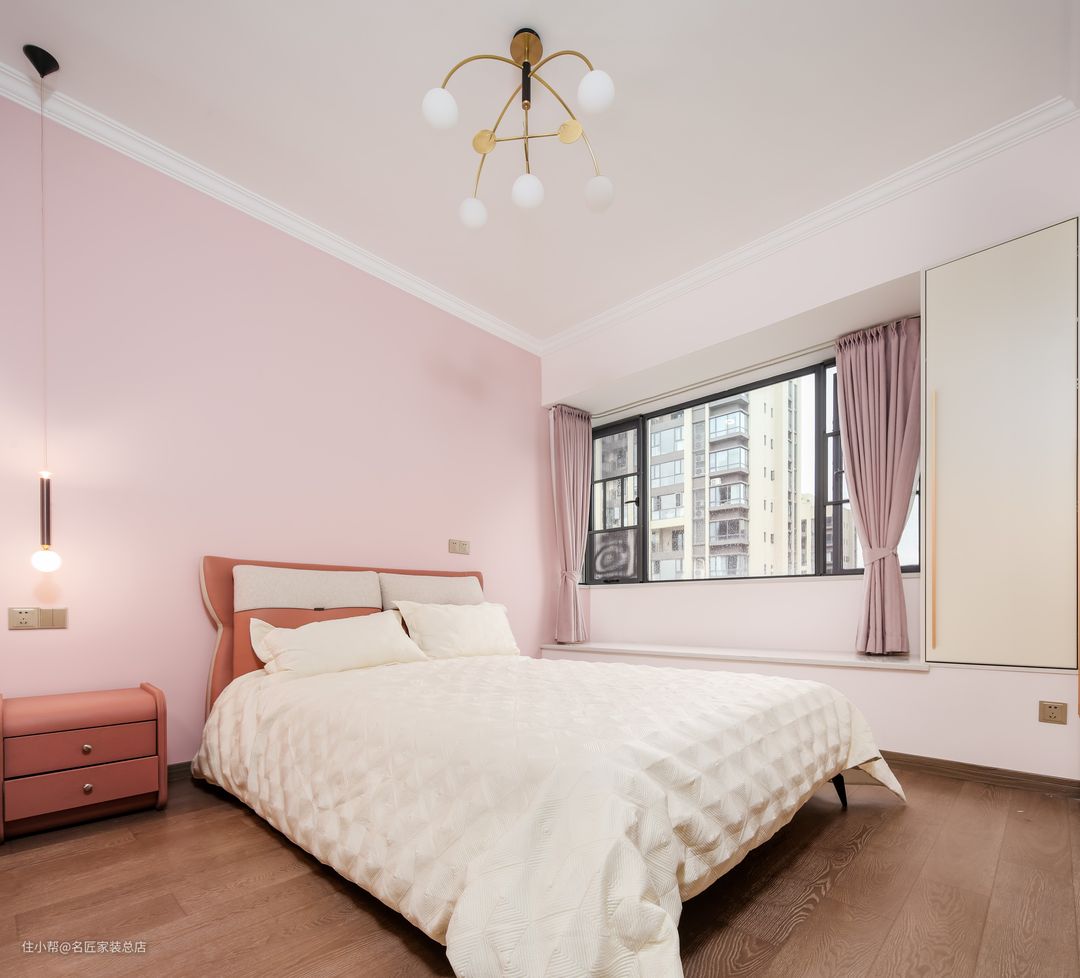 次卧在配色上更偏向于现代感,以粉白配色为主,更符合女孩子的审美,吊灯与床头灯也选用了更为现代化的灯具。在窗户下方位置,没有选择做窗台,而是做成了长椅的形式,更符合孩子的身高。