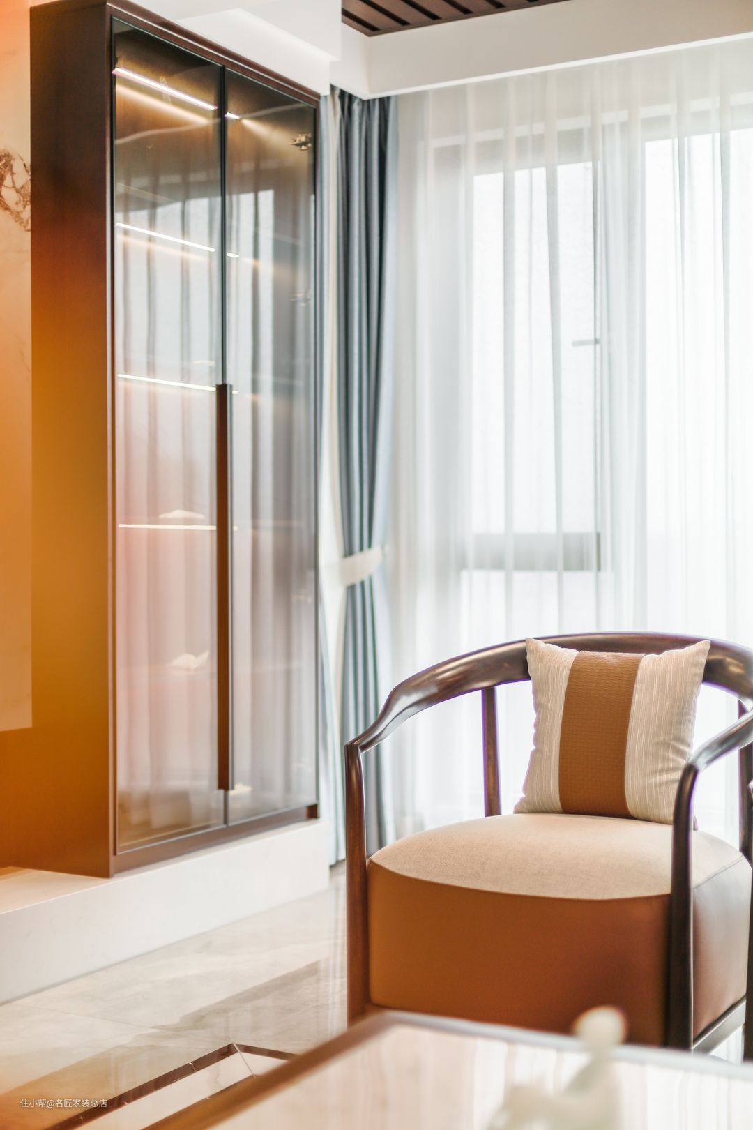 以干净明亮白色为空间主要配色,少许墨色点染出清秀的中式气息。提炼出的中式经典元素简化丰富后,赋予现代化的简洁感,轻松自然的氛围充斥着整个客厅。落地窗采用透光窗帘将阳光引入室内,与客厅自然的灯光配合,整洁的家具陈设,有一股窗明几净的味道,颇具中式风格韵味。