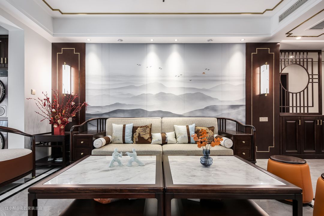 流畅的木质线条,搭配棉麻质感的坐垫,丝绸质感的抱枕摆放其中;侧面的抽屉叠加,做了圆滑处理的边角,以铜色把手为点睛之笔,一切都显得简单质朴又不失该有的华贵与实用。沙发边几与沙发产生色彩上与材质上的共鸣,摆放上花艺摆件进行装饰的作用,让人有一种身临大自然的美妙的感觉。木质茶几嵌入大理石,提升使用体验,一对功夫小人摆件充满韵味。