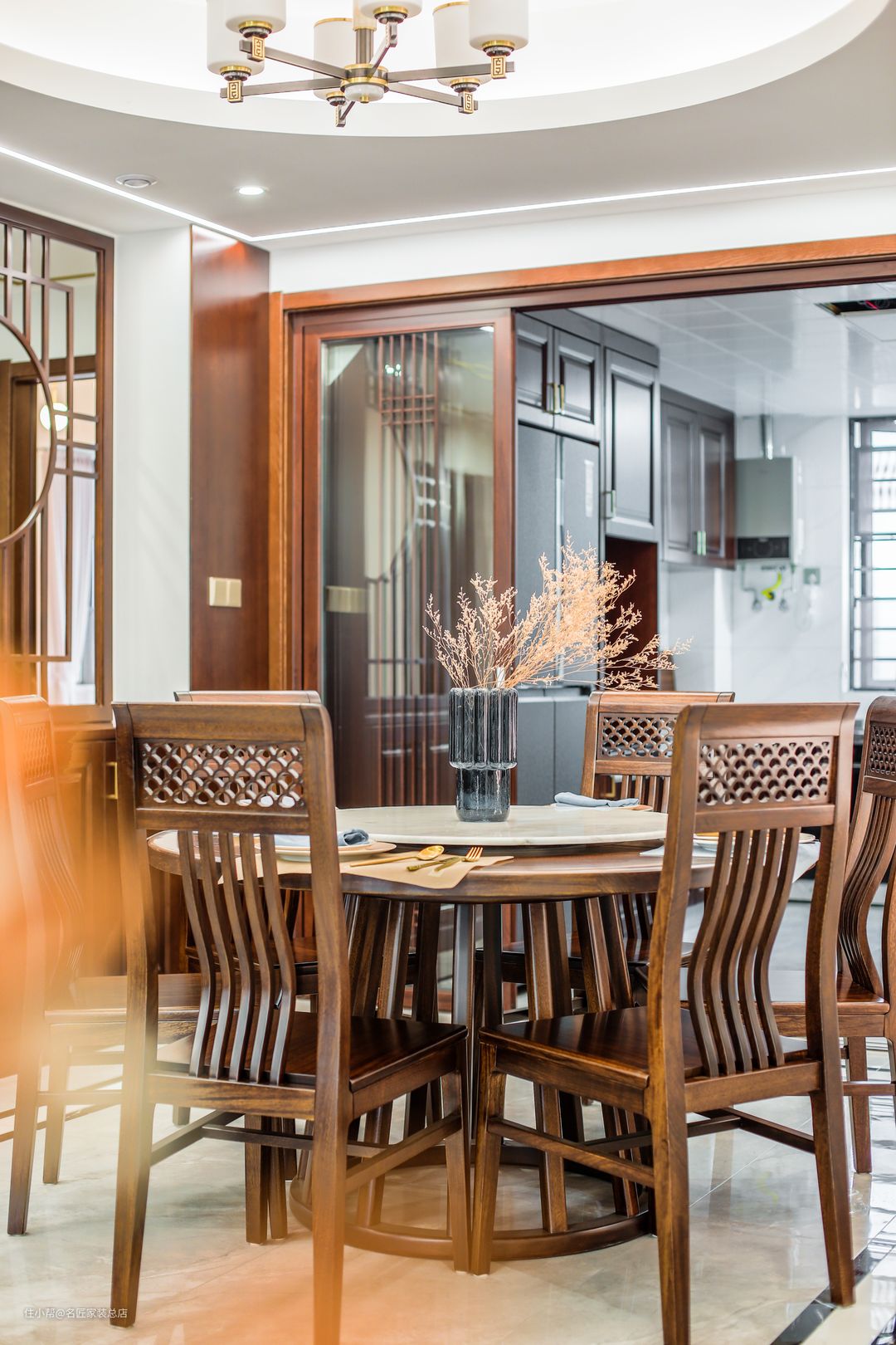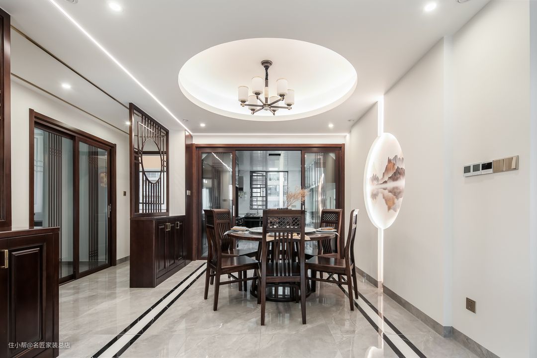 餐厅同样以白色+木制家具为主,吊顶镂空的圆盘加上一圈发光的灯带作为装饰,对称的吊顶灯位于中心位置。背景墙将两面凸起的墙面为装饰,一副山水画嵌入其中,加上室内灯光与引入的自然光线的点亮,显得整体空间大气明亮。餐边柜干脆使用了屏风的样式,将中式元素融合现代家居。