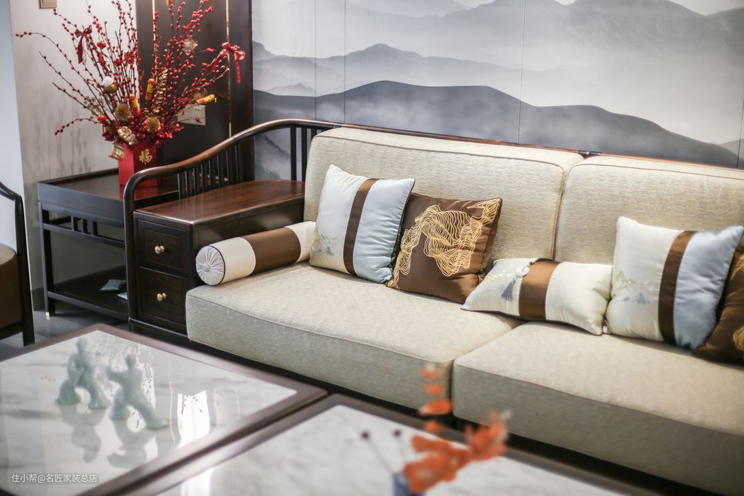 流畅的木质线条,搭配棉麻质感的坐垫,丝绸质感的抱枕摆放其中;侧面的抽屉叠加,做了圆滑处理的边角,以铜色把手为点睛之笔,一切都显得简单质朴又不失该有的华贵与实用。沙发边几与沙发产生色彩上与材质上的共鸣,摆放上花艺摆件进行装饰的作用,让人有一种身临大自然的美妙的感觉。木质茶几嵌入大理石,提升使用体验,一对功夫小人摆件充满韵味。