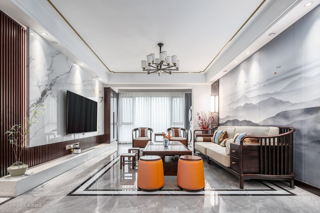 以干净明亮白色为空间主要配色,少许墨色点染出清秀的中式气息。提炼出的中式经典元素简化丰富后,赋予现代化的简洁感,轻松自然的氛围充斥着整个客厅。落地窗采用透光窗帘将阳光引入室内,与客厅自然的灯光配合,整洁的家具陈设,有一股窗明几净的味道,颇具中式风格韵味。