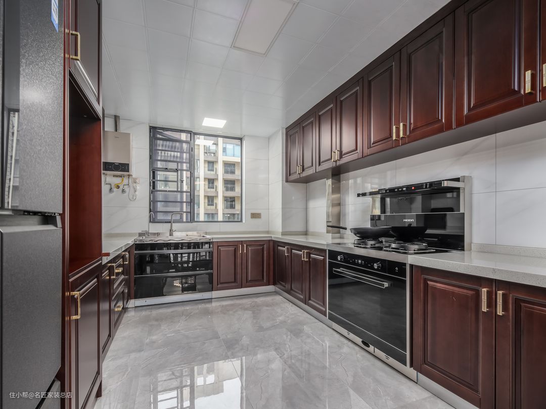 整体橱柜采用实木材质,红棕色的橱柜更显庄重大气,金属把手精巧细致。厨房的所有材质都采用亮面,更耐油污,加上开阔的空间格局,瞬间显得光亮整洁。U形的操作台面功能分区明确,食材处理动线合理。