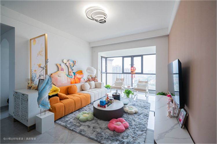 客厅以简约风格为主,灰色毛绒地毯搭配橘色米色双拼直排沙发,打造出温馨舒适的客厅氛围。大平顶的设计使得阳台无缝融入客厅,增加了空间感。沙发旁边的镂空斗柜加花纹磨砂玻璃不仅起到了收纳物品的作用,还在视觉上增强了空间的层次感。整体设计色调和谐,简洁明快。 灰色矮脚电视柜与壁挂电视的现代感相得益彰。具备收纳和放置的功能需求,大白墙营造出明亮宽敞的空间感,而淡粉色的电视背景墙则为整个空间增添了一抹温馨色彩。绿植的点缀使得电视柜两侧更显自然亲和,为这个客厅注入了一股清新自然的气息。