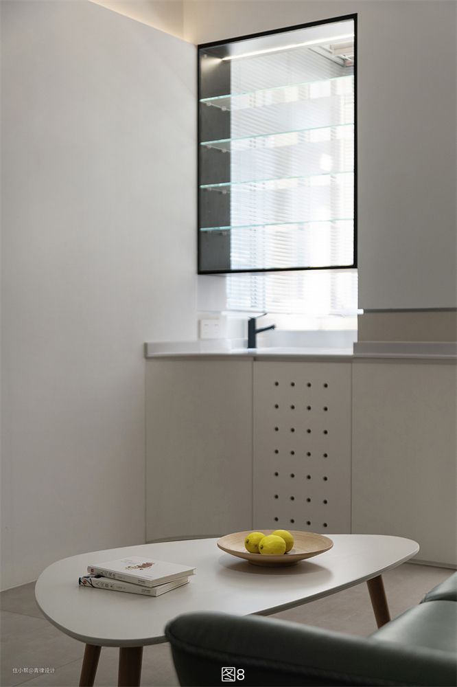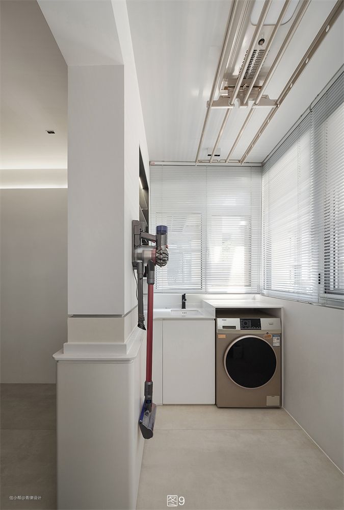 图1:说到客厅了! 先来看下,往电视墙面视角的效果图! 图2:再来看下,客厅往沙发墙面看视角效果图! 图3 、图4、图5、图6:客厅里为屋主的宠物猫“喜宝”在沙发背后的墙上设置爬架系统,由于新冠的特殊原因,她没能进入摄影师的镜头。 悬浮吊顶辅予无主灯的设计,使空间的轮廓感和轻盈性以及层高感增加不少! 图7:电视墙面有异于传统客厅空间中关于电视墙中心轴对称的布局,我们设计的非对称的均衡感,使客厅与南阳台之间产生有效对话,用自然的手法带出流动的形体。 图8:弧度电视端景墙与阳台的洗衣柜形成一个有连续性的收纳体系,由于原先卧室改成的客厅,在东西向的尺度不充裕,所以我们将电视器材柜偏移至与阳台相隔的“透明温室玻璃吊柜”下方,且用“洞洞板”做柜门,保持遥控器与器材之间的可控性,也为放置在柜体內的器材散热保留了余地。 借助南向的光线,设计了嵌入与阳台门洞的透明玻璃盒体,这里是屋主多肉植物的温室! 图9:南阳台与客厅成为一个整体,但独立的功能还是日常的必备。 微水泥和百叶帘在此处与自然的光线每日拉起着平静悠长的光斑连戏剧。 洗衣机+搓布池+吸尘器+升降晾衣架,使这里成为“家政区”。
