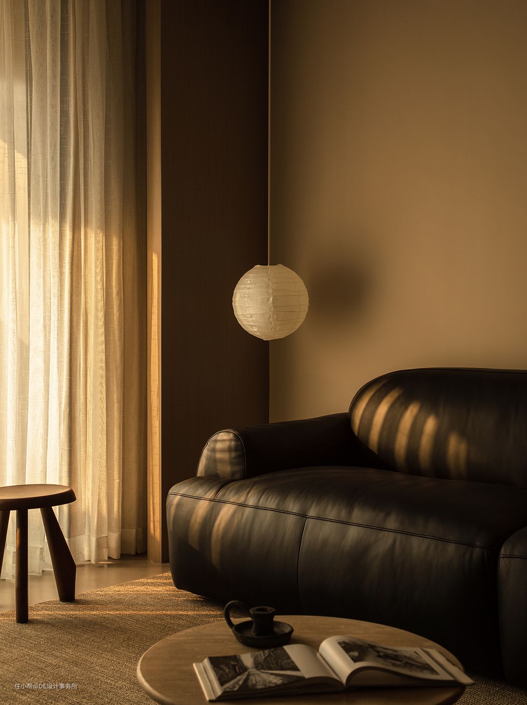 阳光让整个暖黄调的空间看起来很松软,光影,仿佛强调了时间和物体的关系,在不同的时间段,家里的器物有着不同的阴影,生活仿佛融入了禅学的美感,干净而又纯粹,治愈心灵。整面的柜体打造而成的一体式电视墙,内嵌胡桃木开放式格子,下方同色系开放格,增加层次感,共构视觉平衡。