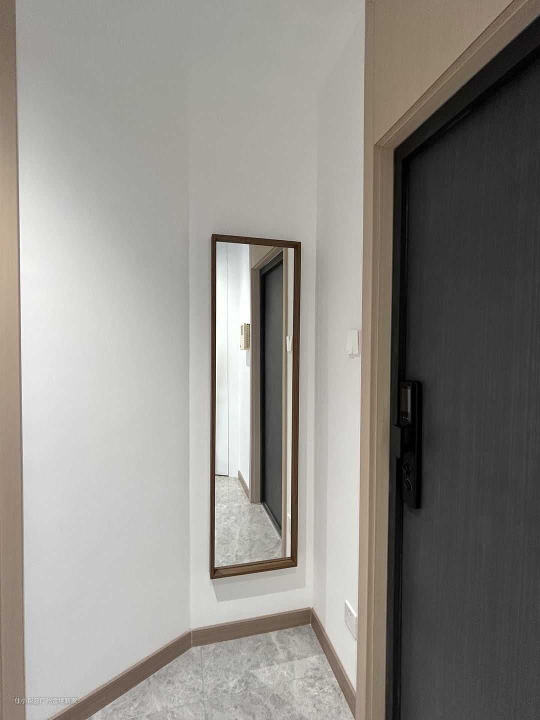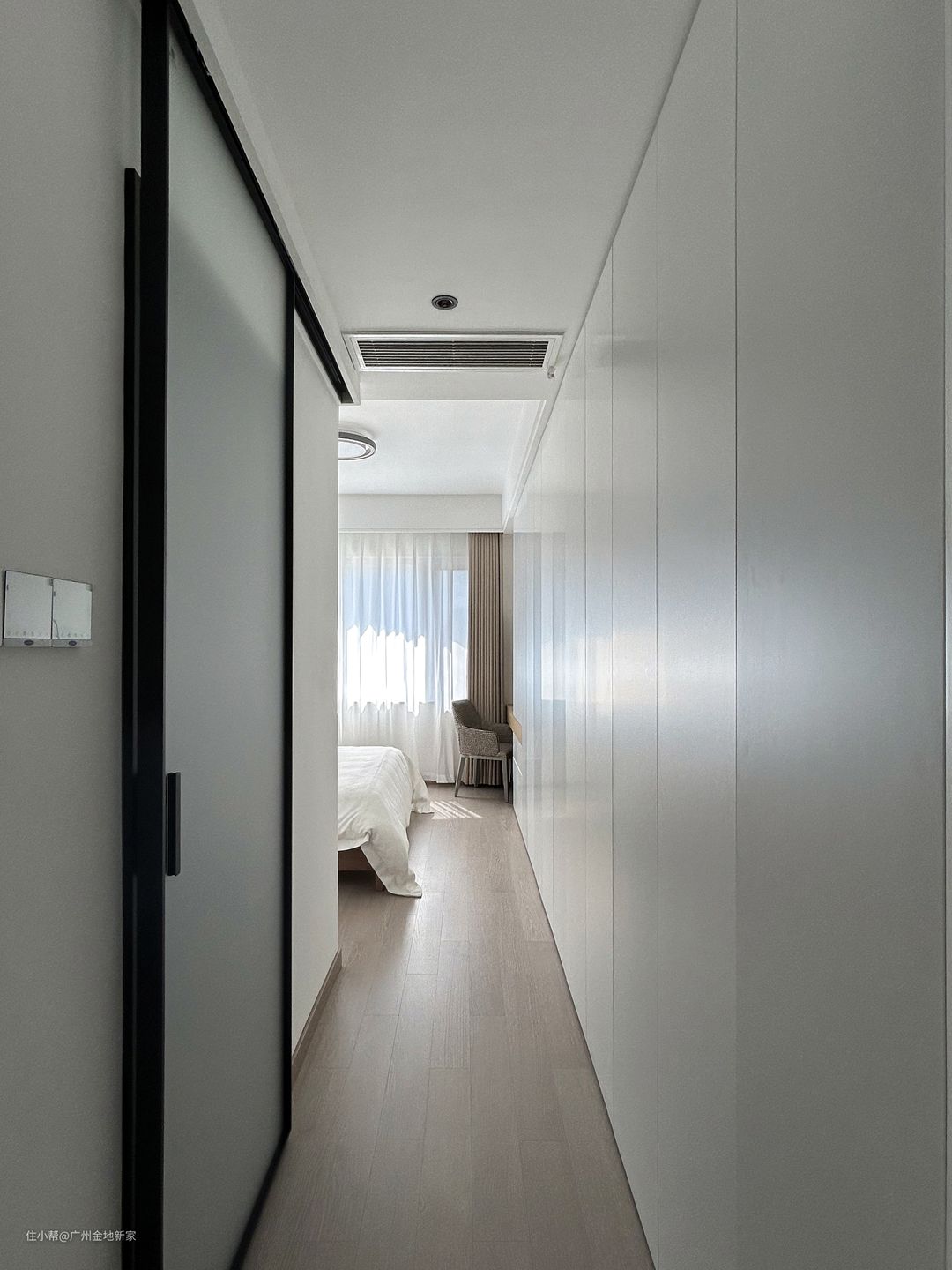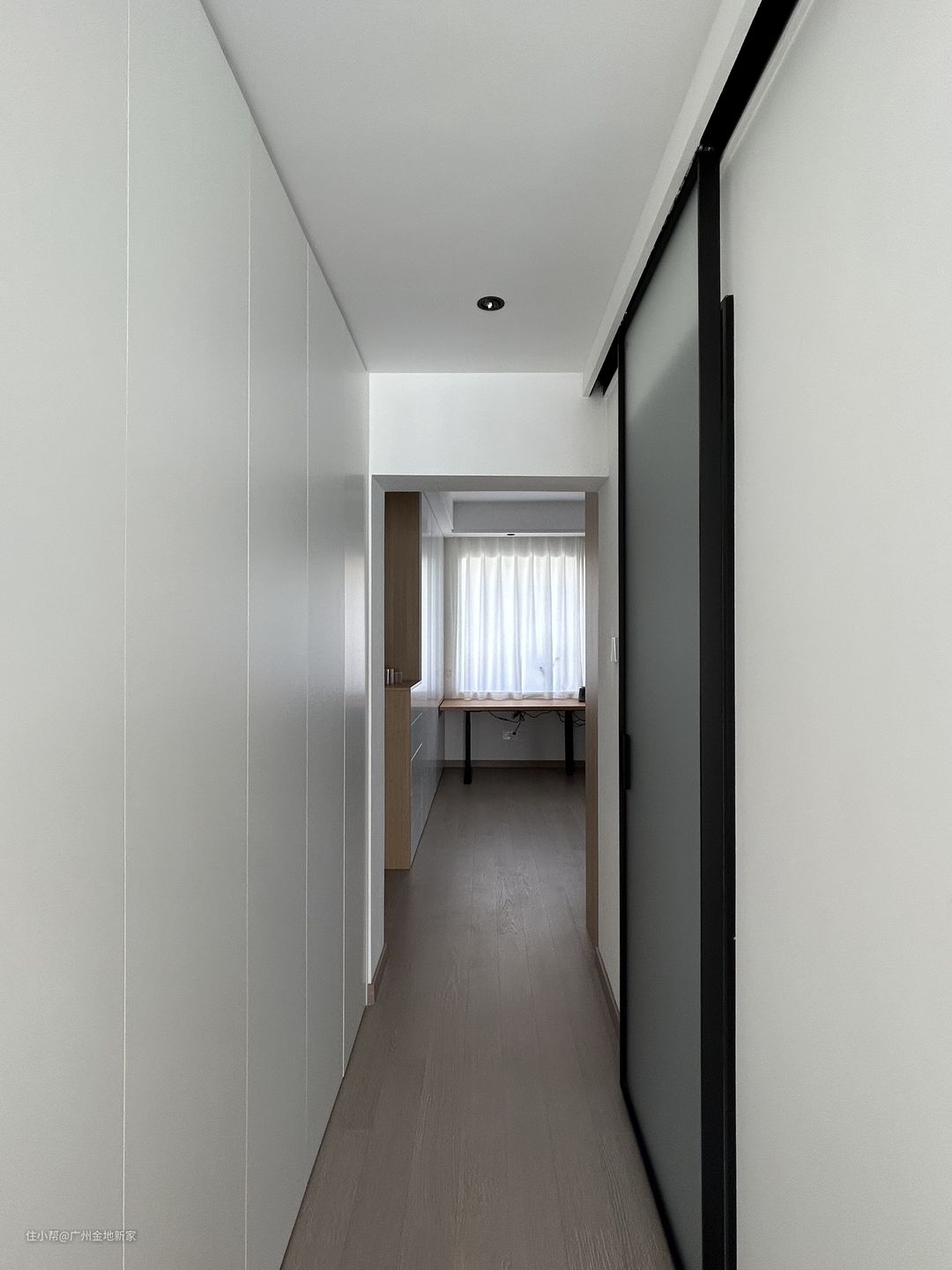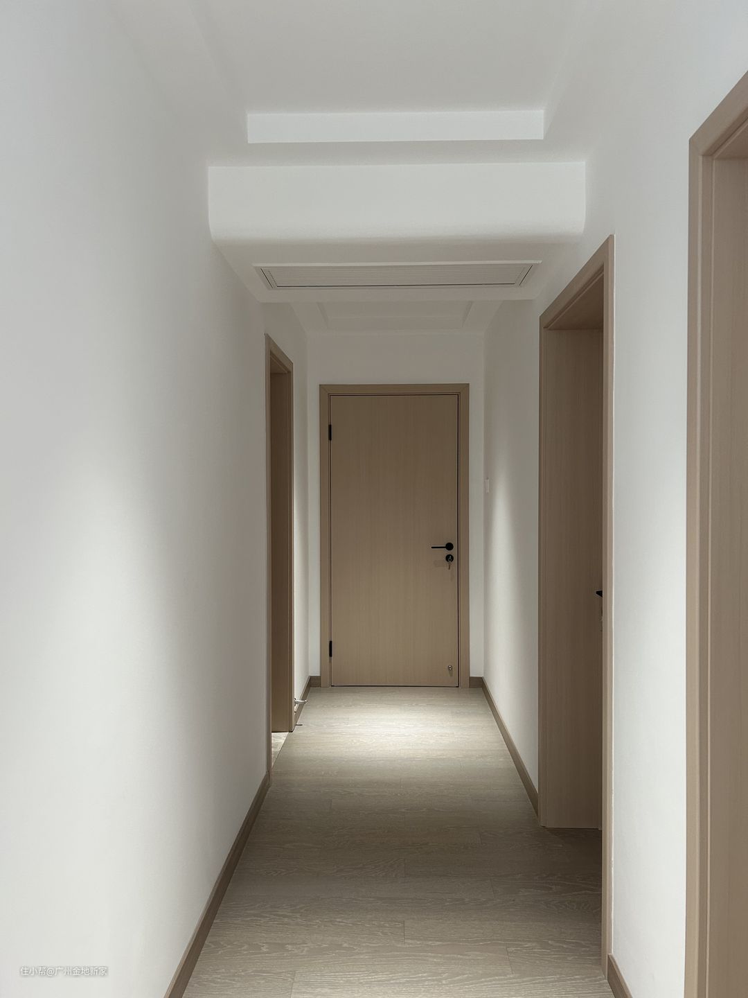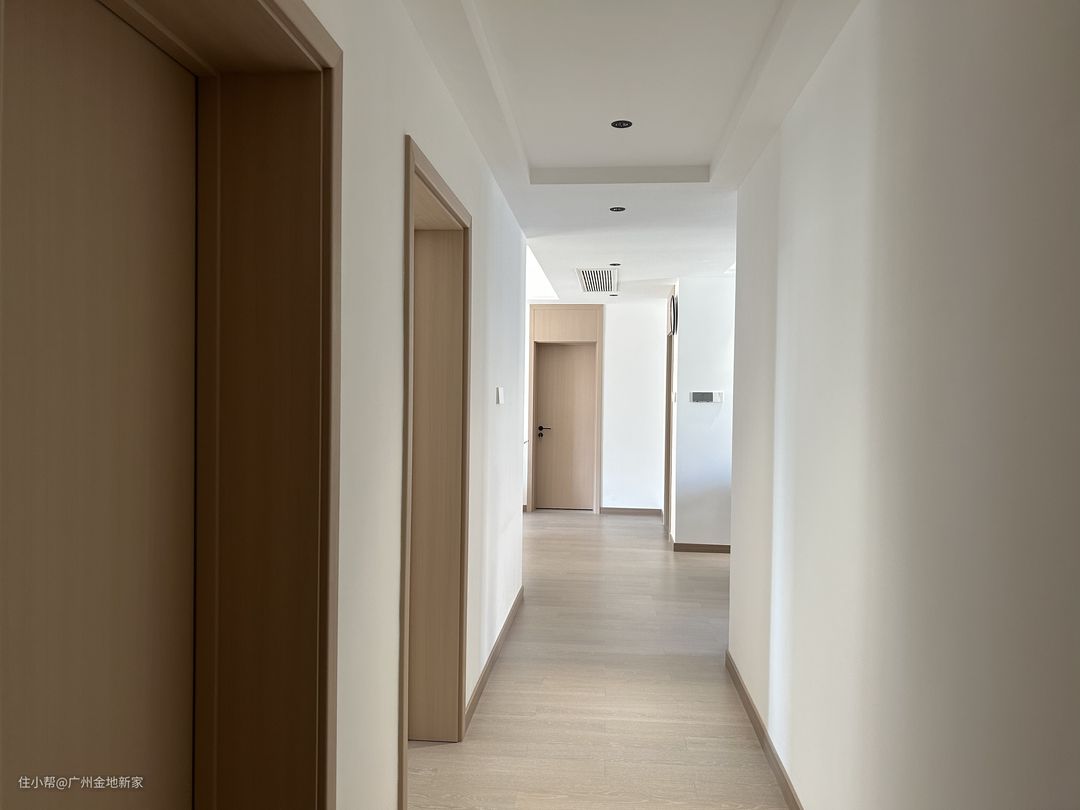 过道也十分简约,房门统一采用浅枫色实木门,配置黑色金属把手,大白墙与浅色木门相间分布,深色踢脚线存在感极低。横梁与两盏灯管营造出明暗交替的光影,加强空间的纵深感。