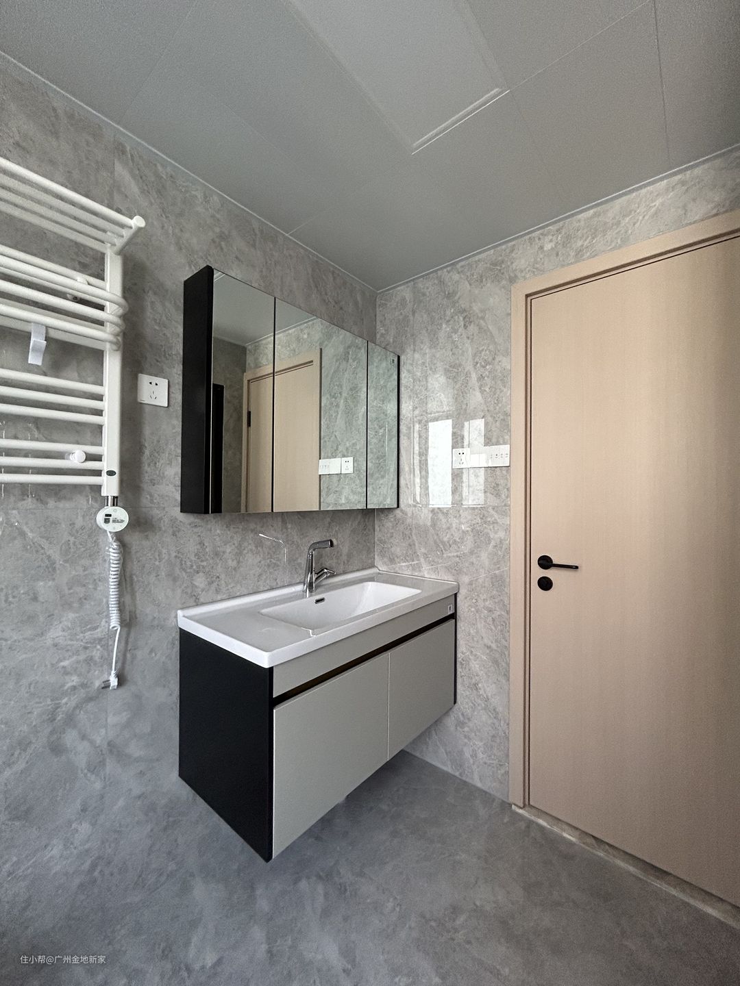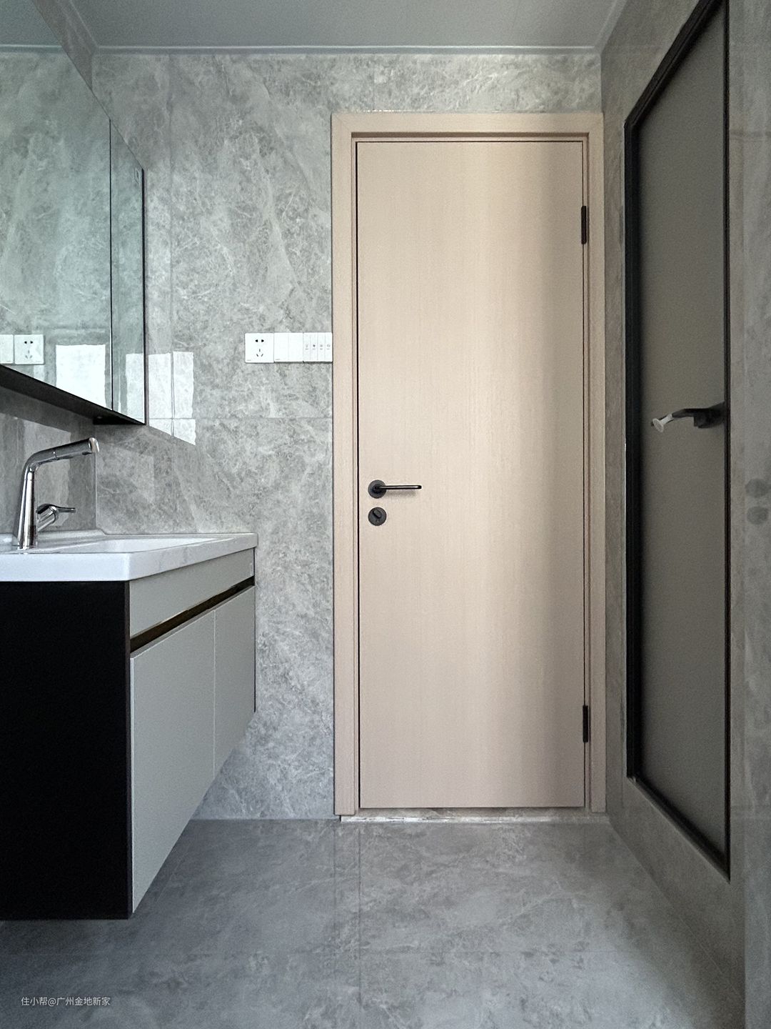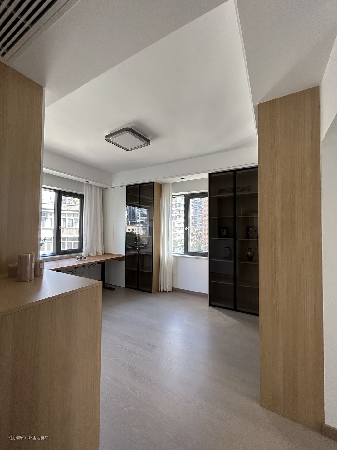 主卧入门处的过道贯通定制的收纳柜体,肤感的白色木饰面加上无门把手的设计,削弱柜体的存在感,显得简洁大方,入门左侧一旁是主卫,用上滑轨的磨砂玻璃门做隔断,狭长的过道更加敞亮。 衣柜与书桌一体式设计,原木色台面自衣柜延伸而出,带来精彩的撞色。墙壁仍然运用格栅元素,使空间更有立体感。黑白格花色靠椅经典时尚,丰富了房间的配色。 床头选用深色的原木靠背与床头柜用来储物,细腻的木材纹理简约耐看。枫木地板搭配相同颜色的窗帘,阳光映射在轻薄的白色纱帘上,为房间增添了几分温馨柔和的氛围。 门口过道另一侧是卫生间,浅咖色大理石瓷砖铺满整个空间。三面透明玻璃门圈出钻石型淋浴间,干湿分离。马桶上方安装电热毛巾架,能够去湿杀菌。小窗设计通风透气,增强采光。 衣帽间原为卧室,应屋主要求作衣帽间+书房两用。房间极其简单,黑白和木色贯穿始终。 入口处为原木置物台,用于搁放一些小物品,多层抽屉分层收纳,美观实用。 因为屋主需要较宽敞的书桌台面,定制做了与收纳柜一体式的一字型办公台,不仅能同时容纳多人办公,两边的柜体也用于储物,整体更加的统一整洁。 两面开窗,拥有优越的采光条件,薄帘用来遮挡强光,拉上帘布也可以感受到明亮的光线,适合办公。右侧的柜体柜门为黑色透明玻璃,屋主打算用来放置书本与摆件。透明的设计既能让放置的物品一目了然,也避免了落灰,更利于物品的保存。
