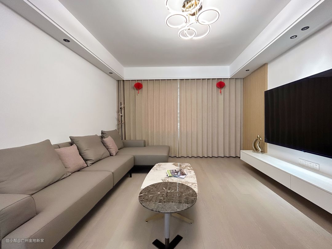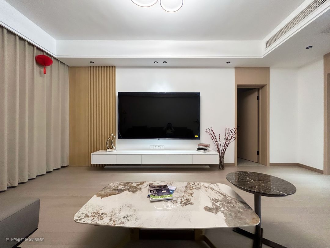 房子的木材主要采用枫木,客厅灵活地运用这枫木色系进行搭配。窗帘与浅色枫木地板颜色相近,形成视觉上的延展感。 沙发是干劲利落的方块状,与条形的悬浮电视柜、双眼皮吊顶构成一组组平行线条,给人观感上的舒爽。同时圆形与带有弧度的长方形茶几中和了硬朗的线条,柔化了空间氛围,也能避免磕碰,更加安全。 电视墙主体为白色,左侧拼接原木格栅板,右侧与枫木门板相衔,木质感十足。下方电视柜为悬浮柜体,多个抽屉设计,既能置物又能藏物,打扫卫生也非常便利。