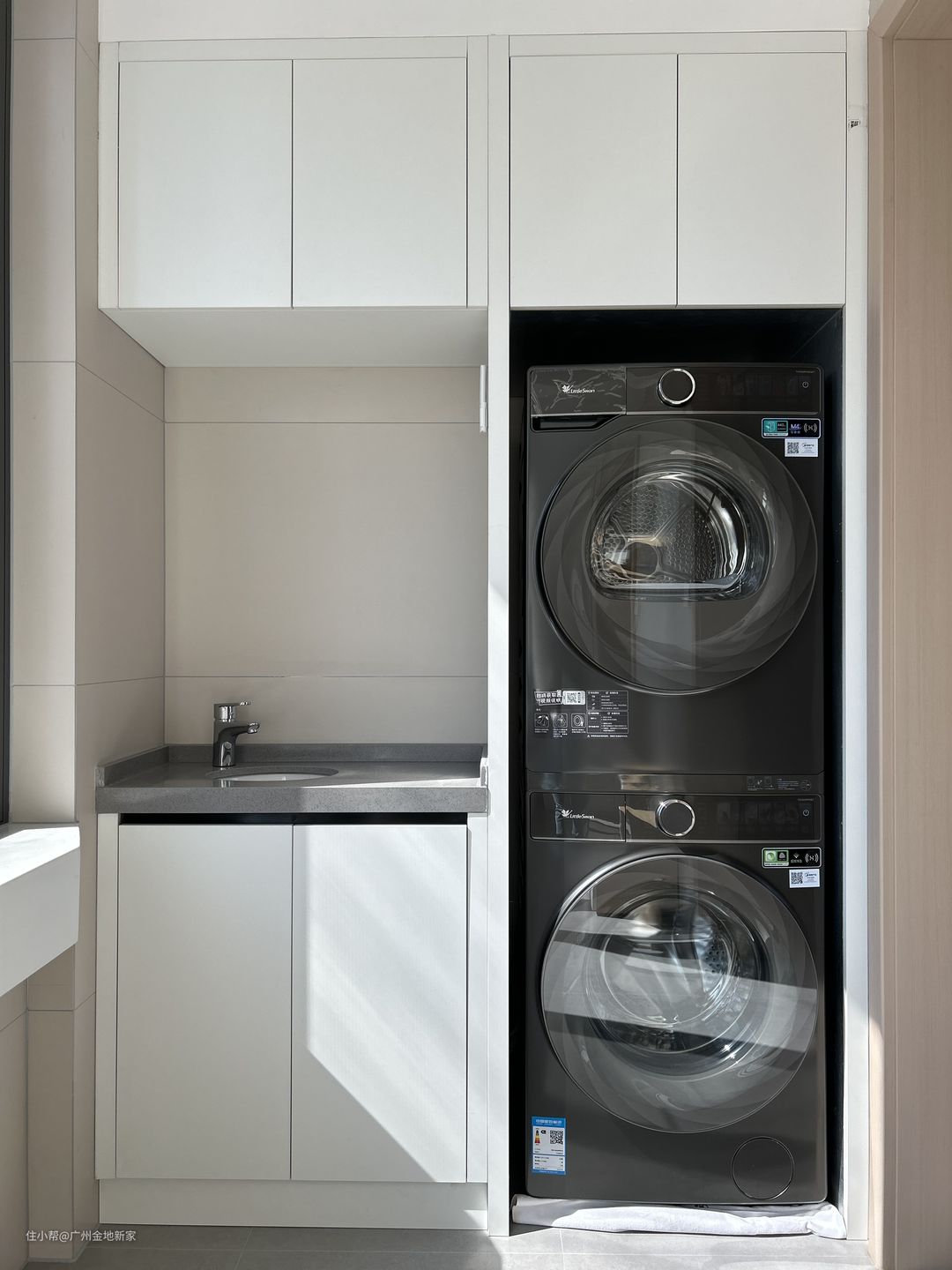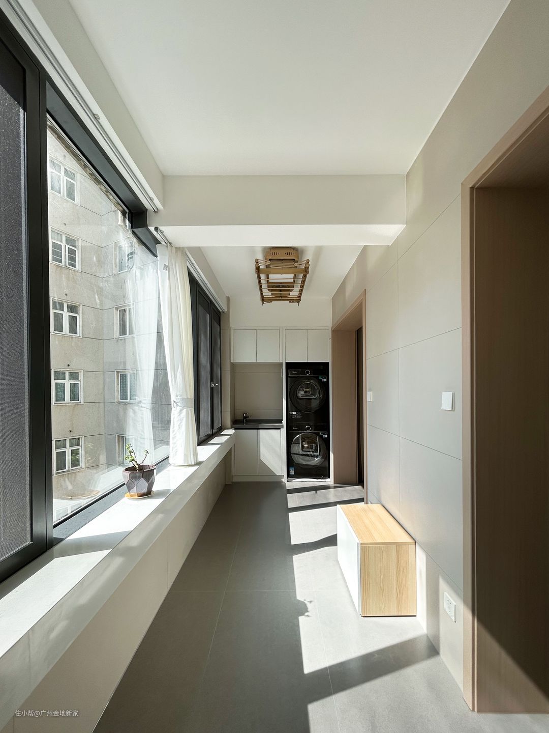 阳台做了大面积封窗处理,一字型的窗台可以供屋主摆放几盆苍翠的绿植,就能打造一个鲜活自然的小花园啦❀!长方形的空间一侧为整面储物柜,一面用作安置洗衣机、烘干机和洗手台。老人房一侧的阳台顶部安装可伸缩晾衣架,洗衣、晾衣、储衣都非常方便。