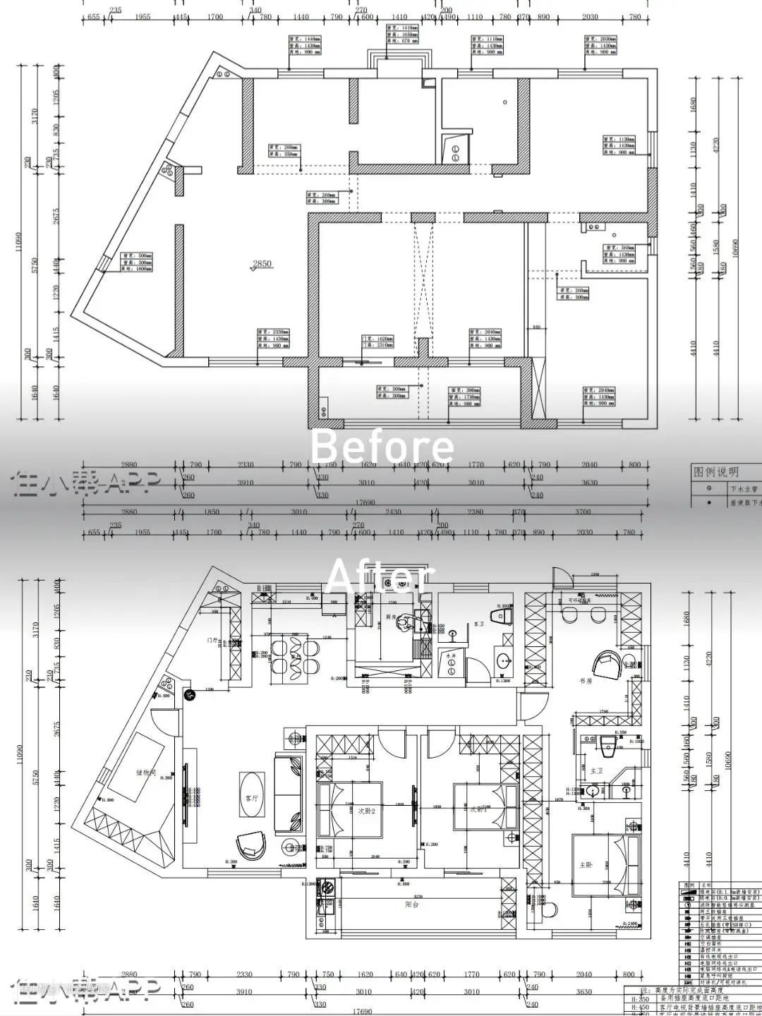 【户型图设计思路】 1、将一个次卧改成书房+衣帽间的设计,弥补主卧衣帽间空间太小的不足; 2、同时拓展了主卫空间,原户型的主卫空间窄小,划分的淋浴间太过狭窄,生活不便; 3、将主卧靠窗的墙体打掉一部分,做了一个与衣柜一体式的小书桌,使得房间更加便利; 4、玄关与储物间为异形空间,分析夹角尺度,尽量利用设计隐藏边角。