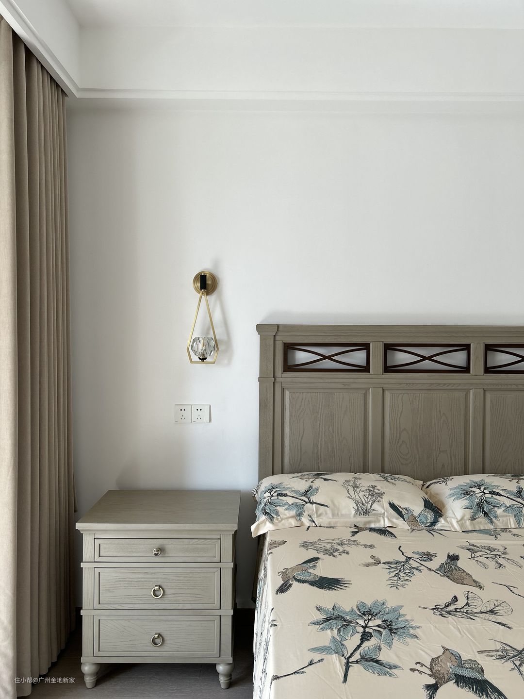 因为屋主的母亲偶尔会过来居住,所以房间布置得比较简单。门口处的满墙柜用来放置衣物,床头拐角处的柜体中部隔断,地柜充当床头柜用来置物收纳,整体性更强。 因为老人喜欢更加沉稳的颜色,床靠背与另一侧床头柜采用颜色更深的灰橡色。床单选用略带古韵的花鸟草木,靠背形似屏风,床头柜与壁灯为复古造型,整体风格更加典雅庄重。