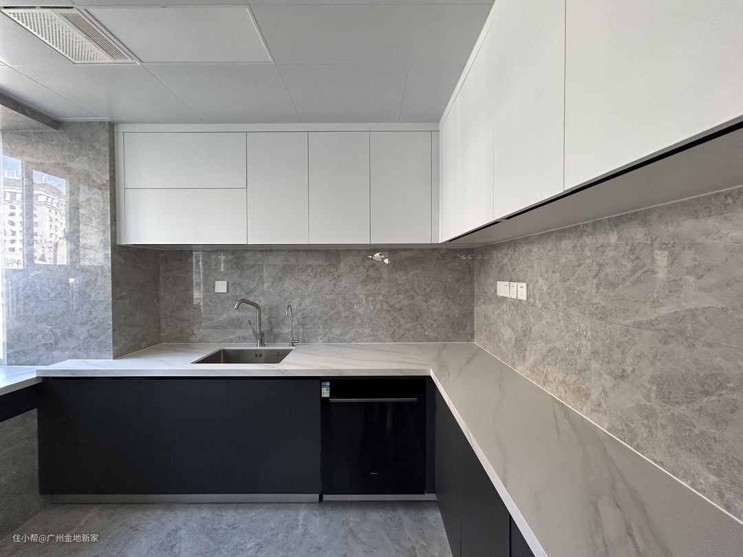 厨房宽敞透亮,U型台面与三面顶柜提供巨大的收纳空间,以半围合的方式形成一条流畅动线。台面集储物、清洗、备餐、亨饪多项功能于一体,同时内嵌燃气灶、电器柜,整齐简洁。 因为房子是老式户型,没有烟道,所以屋主在窗户处安装双排气扇,能够直接将油烟排出户外,还能通风换气,非常适用~