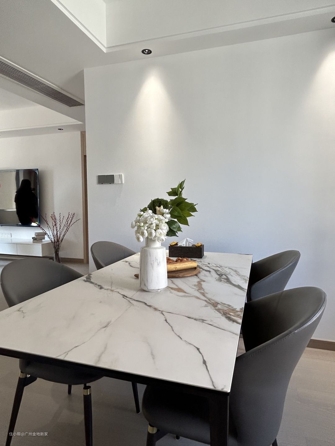 餐厅为开放式空间,白色大理石桌面搭配深灰色餐椅,带有北欧风情,ins风的陶瓷花瓶与素雅的花朵相配,更显清新自然。屋主在这样的环境下进餐,还能透过窗户欣赏景色,好不惬意。 餐边柜的地柜与墙面浑然一体,带有花纹的岩板柜台看上去高级有质感。为了增加收纳空间,另装了一个顶柜,原木柜体配置黑色玻璃柜门,既不会落灰又起到装饰作用。
