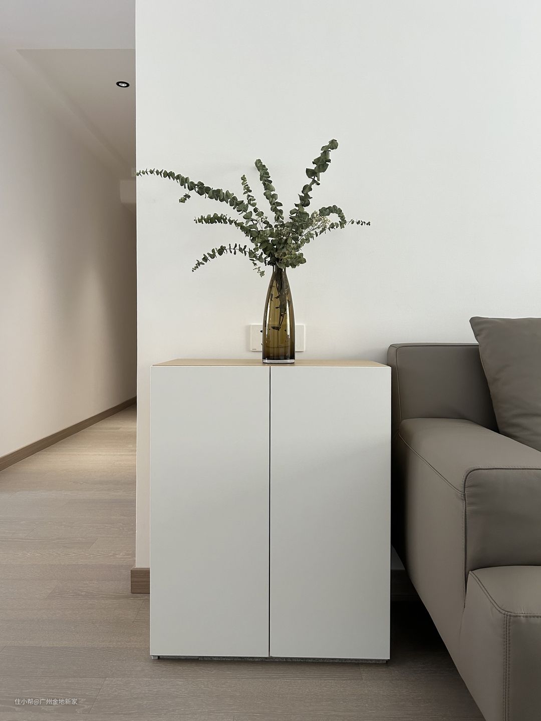 一打开房门,说不定会被这极度简约的玄关惊到,大片的奶白色加上一点点原木色点缀就构成了玄关的色彩。实木储物柜中部镂空用于置物,镂空处的墙壁安装电力轨道插座,高级实用;下方预留15cm的空间用于摆放日常换穿的鞋子。玄关为异形空间,设计师巧用角落处安装穿衣镜,从视觉上扩展了空间。