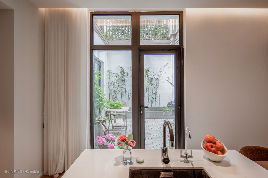 封上庭院而增加室内空间,这是同居住区多数业主的选择。但女主人更愿意打开庭院,让室内与室外景色交互流动,消解位于地下一层的封闭感。 在洗涤备菜时抬眼便能观赏室外庭院的绿植景观,从一方天地里感知四季的流转。 女主人在庭院里种了竹子、月季、绣球和石榴树等植物,可「春能赏花,冬能赏雪」沉浸式感受四季的浪漫。