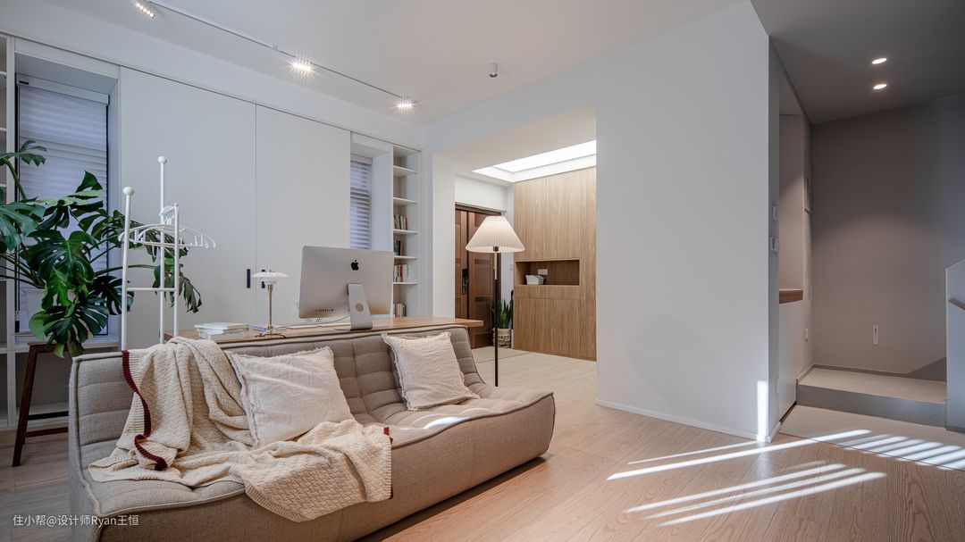 1、玄关顶部借用软膜天花开一扇「天窗」,模拟自然光一扫昏暗与压抑感;并且从视觉上拉伸层高,空间更显开阔敞亮。 2、男主人每天需要在家直播,白色书柜可作为背景板,简约又实用。 3、上方射灯增加空间的辅助照明,再搭配落地灯补充空间中层照明,满足男主人晚上直播时的灯光需求。