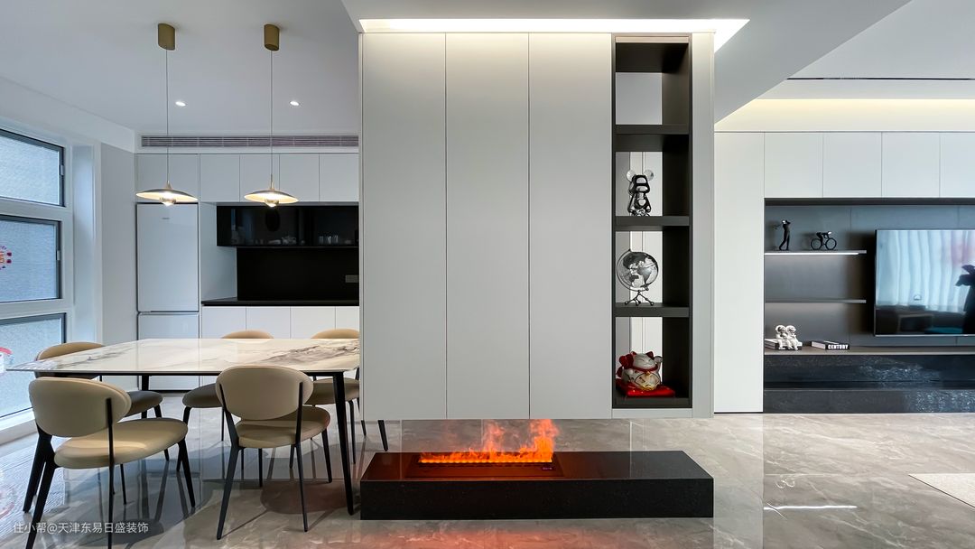 推门而入的玄关,简洁纯粹。壁炉+悬空的玄关柜组合的方式,不仅满足了主人的收纳需求,同时也很好的分割了客厅与餐厅空间,让人一进门就感受到了主人的贵雅之气。 壁炉可以说是整个家在装修中的C位担当了,但对于国内住宅来说,真火壁炉还是较难实现。 综合考虑之下,设计师选择了氛围感更好的雾化壁炉,既有火焰燃烧的视觉效果,本身又是个加湿器,对于天津北方这座干燥的城市,在冬季来到时使用也会比较友好。 入户右手边的玄关柜做出“顶天立地”的设计,但是中间是有镂空设计,底部有悬空的设计,并且搭配了灯光的设计,这样的设计既美观又实用,并且巧妙的利用了空间位置。