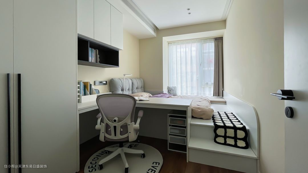 设计师以孩子的视角去打造儿童房空间,布局设计与光影相映成趣,营造出舒适有趣的学习、玩耍氛围。可爱充满童趣的摆件,更添儿童房的一份天真纯粹。 设计师为空间植入童趣元素,台阶的设置让孩子可以在这里尽情释放天性。 并且,设计师通过敏锐的视角挖掘空间可能性,把握功能与意趣之间的平衡,将保留孩子成长中每一份童真,明朗而充满朝气。 该空间以白色为主,构成空间主要色调,定制衣柜、书柜、学习桌,上方睡眠+下方学习设计,整个空间成为小朋友的生活学习的独处乐园。