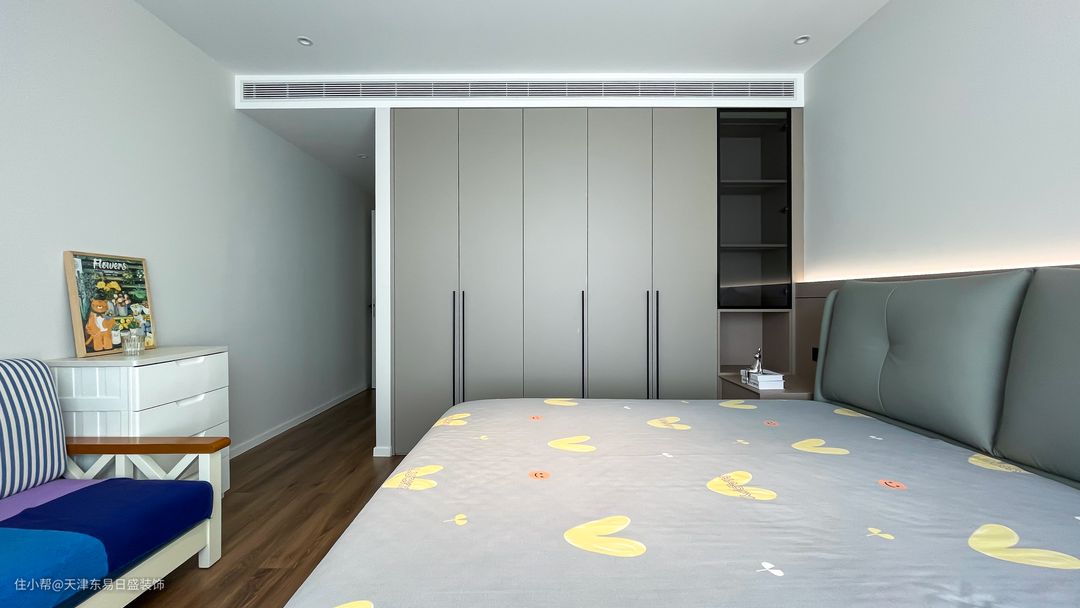 简雅而恬静的主卧室空间中,灰色的硬包床背景与白色墙面融为一体,线性隐藏灯光点缀空间增加了屋子的艺术感。 主卧以灰白为主色调,床头背景嵌入灯带,布置简洁高级的布艺床,在灯光的烘托下,让空间显得格外的现代优雅、安静端庄。 温婉和煦的休憩空间,柔美细腻,暖阳洒进室内,温润的色调缓解了都市生活的疲倦,主卧套房空间的和谐色调安静而优雅,时光在温柔中缓缓度过。 以面构体,由线显美,采用统一的纯色调节明暗分区。定制浅灰色衣柜融入背景墙面,满足业主大规模衣物收纳。