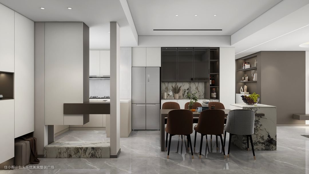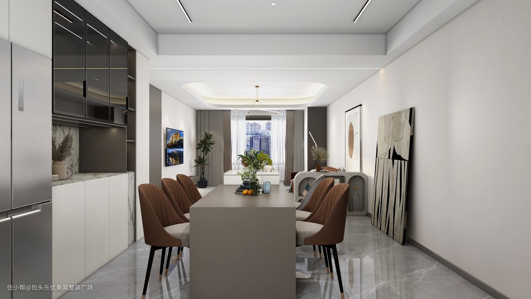 岛台与餐桌合为一体,餐桌使用“夹心”设计,有趣灵动。岩板、玻璃等材质,让空间跳脱出面积的局限性,拥有了呼吸感和现代感。