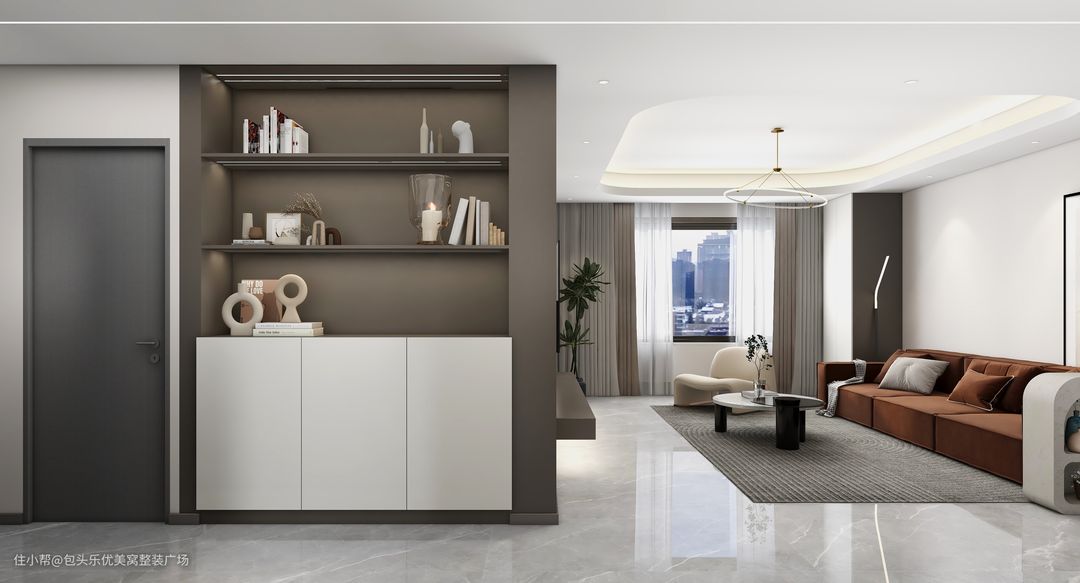 进门入眼是两组鞋帽柜,内部根据自己的鞋子、衣服款式设计格局,实现化合理收纳;侧面是镂空造型,下方是抽屉收纳,室内“漏景”若隐若现。