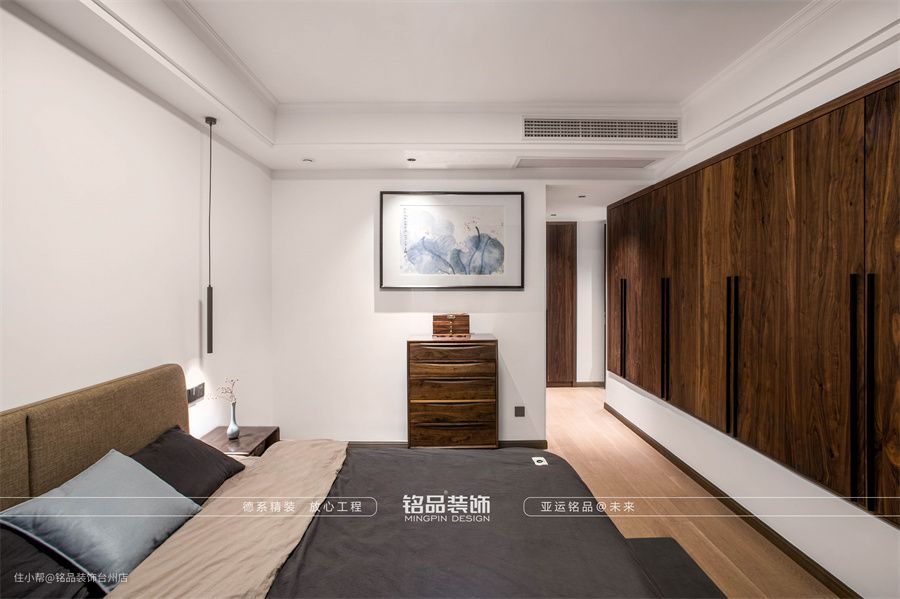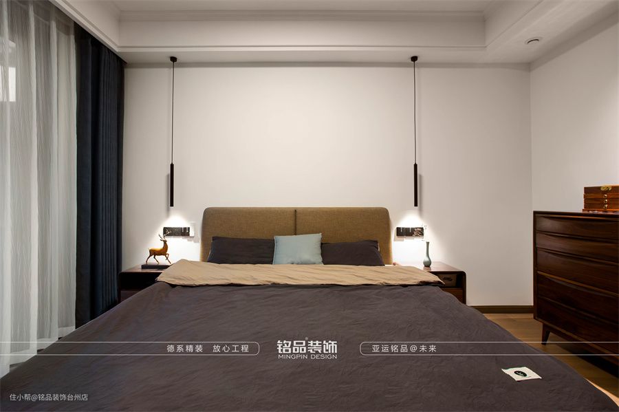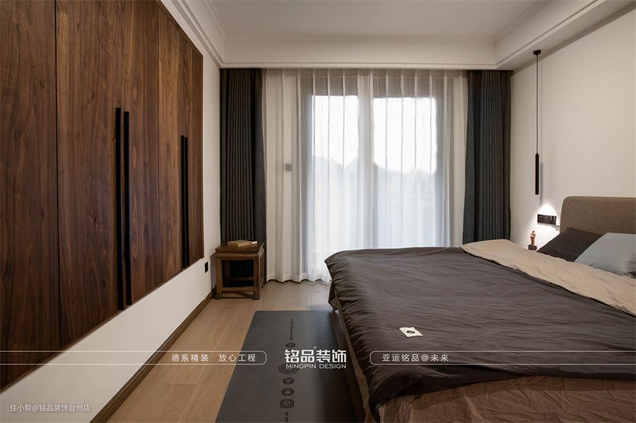 主卧设计更偏复古一些,在深棕色调的空间里,营造出静谧且柔和的氛围,满满散发着的原木本身的韵味,使淳朴的自然美感,盘旋在整个空间。