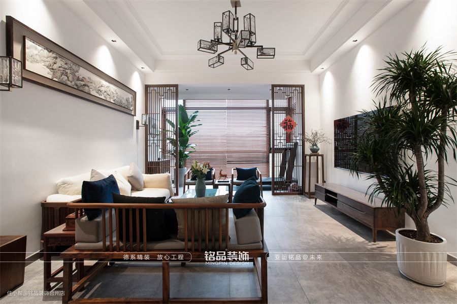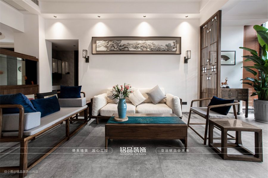 沙发和单椅做了半包围的组合,灰白色的布艺和胡桃木框相结合,让躺或坐有更舒适的体验,整体空间意境村托出无限中式韵味。