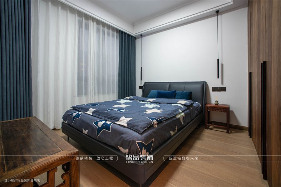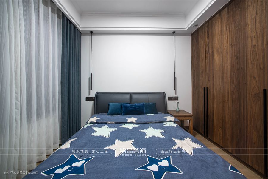 次卧是儿童房,床头以白墙为底,搭配黑色皮床,展示男孩的率性。一侧做通顶原木衣柜,满足日常储物需求,也和桌椅、地板做了呼应。
