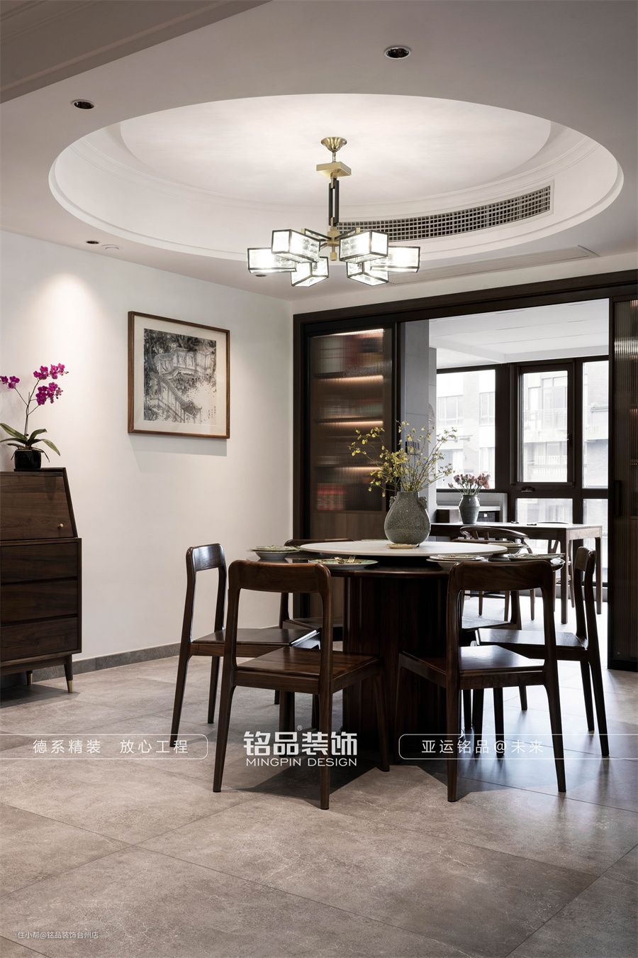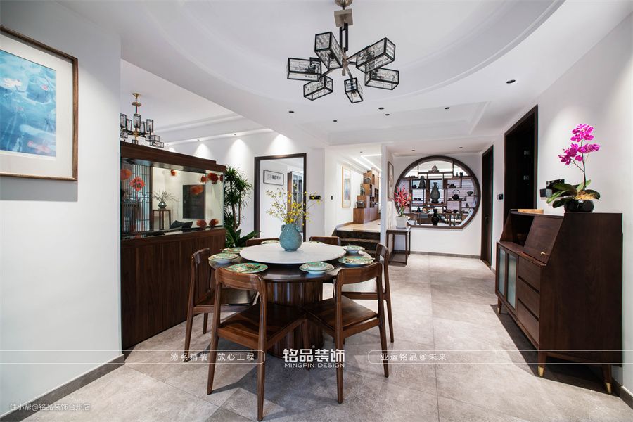 餐桌选用了圆形胡桃木桌,与圆形吊顶呼应,体现了一家团圆的美好寓意。一日三餐,专注于和家人一起共享美食,分享有趣的事物。