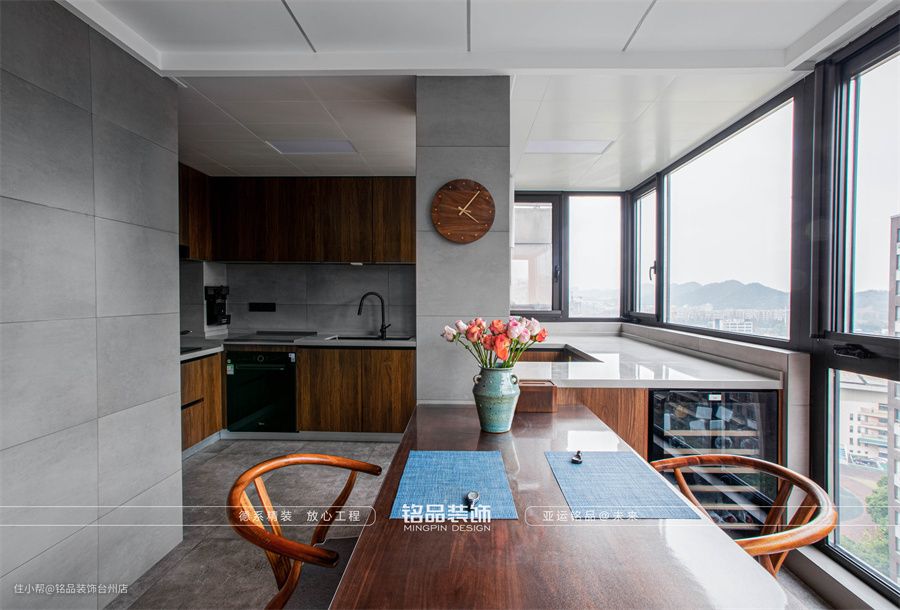 新中式的厨房也可以做得非常有美感,宽阔视野的落地窗布局搭配原木墙柜,时尚而简约,居者在这里可以烹饪、休憩,畅享生活的品质格调。