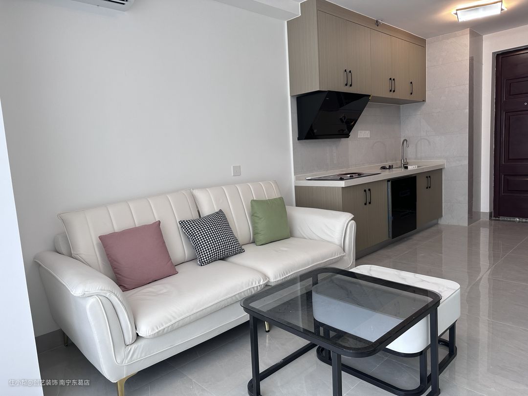 客厅以白色为主色调,搭配布艺沙发也是温柔的浅色系,轻松惬意。大白墙、灰色地砖通铺,无吊顶设计,搭配线条简约的现代家具,没有多余的装饰,简约舒适实用。