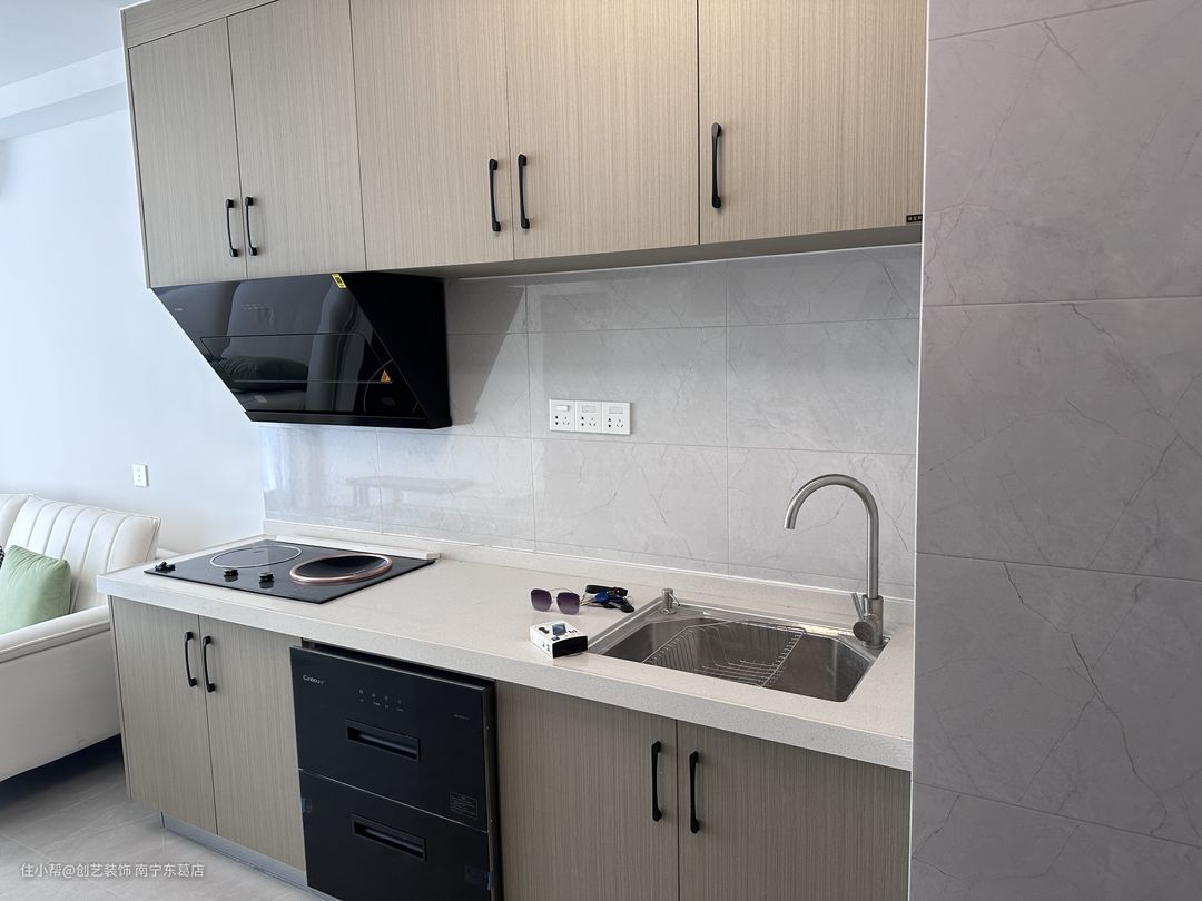 一进门的玄关走廊划分为厨房区域,一字型的橱柜不占太多的空间,木色+白色的配色,一个耐看迷你的小厨房,对于独居的人,完全够用啦