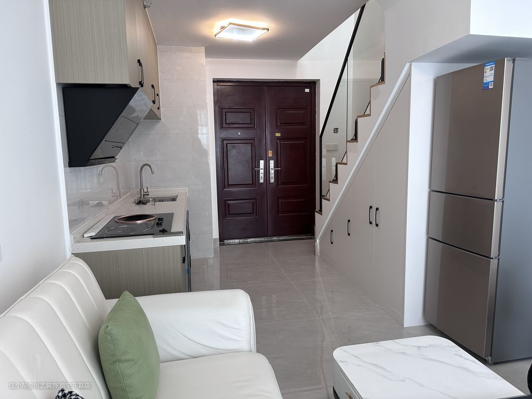 在配色上,用于区分一楼二楼的框架之外,整个家就是原木+白的配色,对于小户型来讲,这就是最实用的搭配。 浅色的搭配增加家温暖的气息,白色的墙面、简约家具为后期软装提供无限可能。可以根据业主的需要而变化。 一楼是客餐厨在同一个空间,集会客、烹饪、就餐功能于一体,开放式布局,很好的延伸视野,整个空间看起来显大。 考虑到空间有限冰箱放在楼梯间下面。 二楼主要是休息睡眠区域,主要是卧室、衣帽间、卫生间。