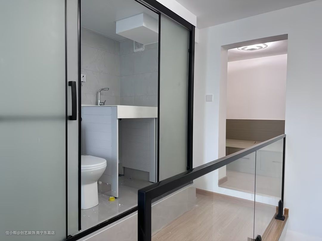 卫生间调到了二楼,缓解一楼的空间使用压力。用玻璃作为隔断,美观度高,还有一定的私密性。在洗手台下面内嵌小型洗衣机位置,满足业主的生活需要。