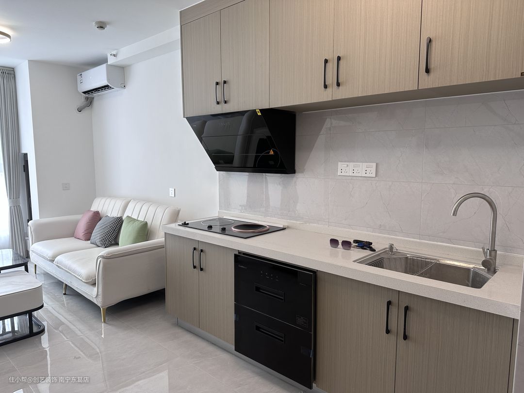 一进门的玄关走廊划分为厨房区域,一字型的橱柜不占太多的空间,木色+白色的配色,一个耐看迷你的小厨房,对于独居的人,完全够用啦