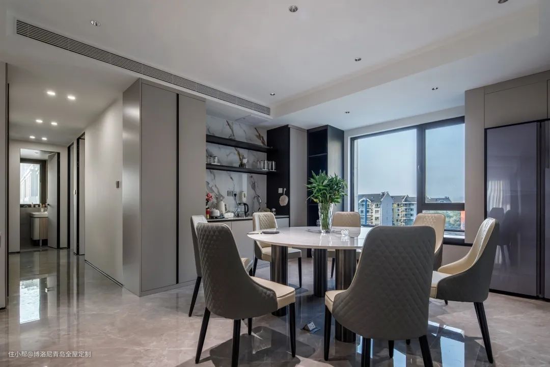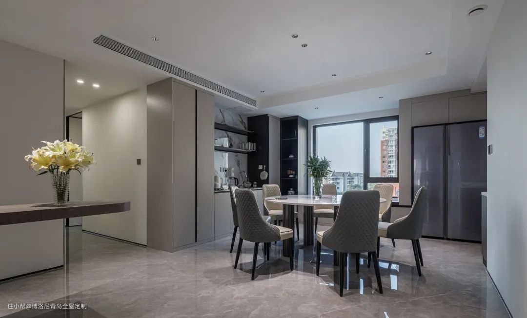 少即是多的餐厅布局 低调含蓄的风格,带来很强的可塑性 无主灯式设计有着利落的视觉感受 凝聚着高贵优雅的生活状态