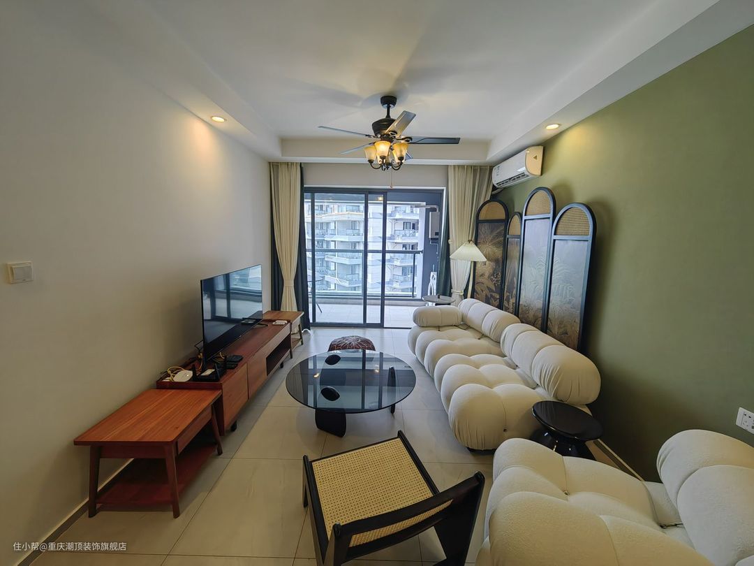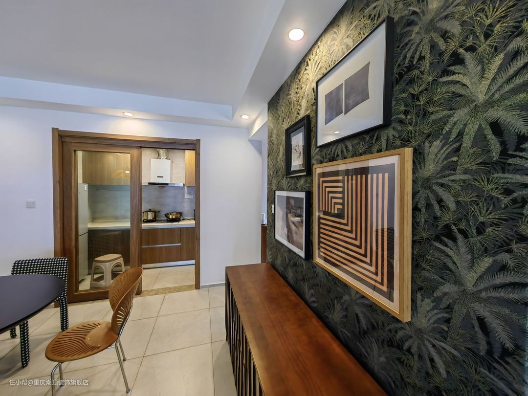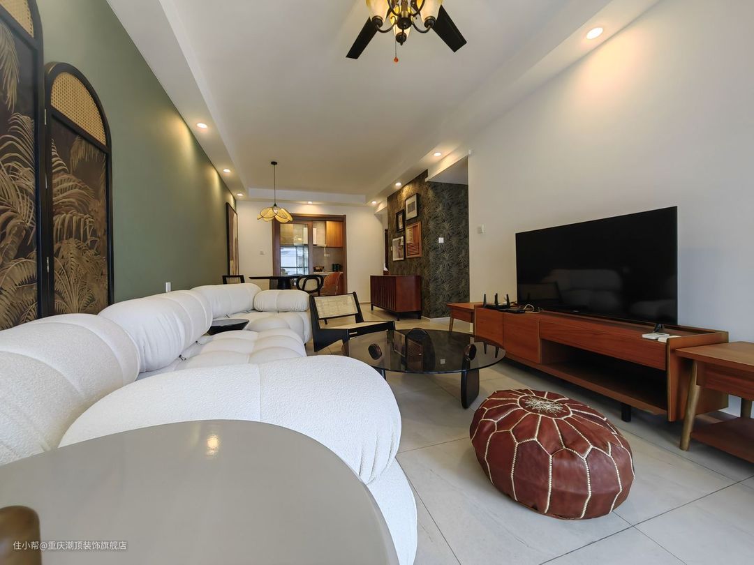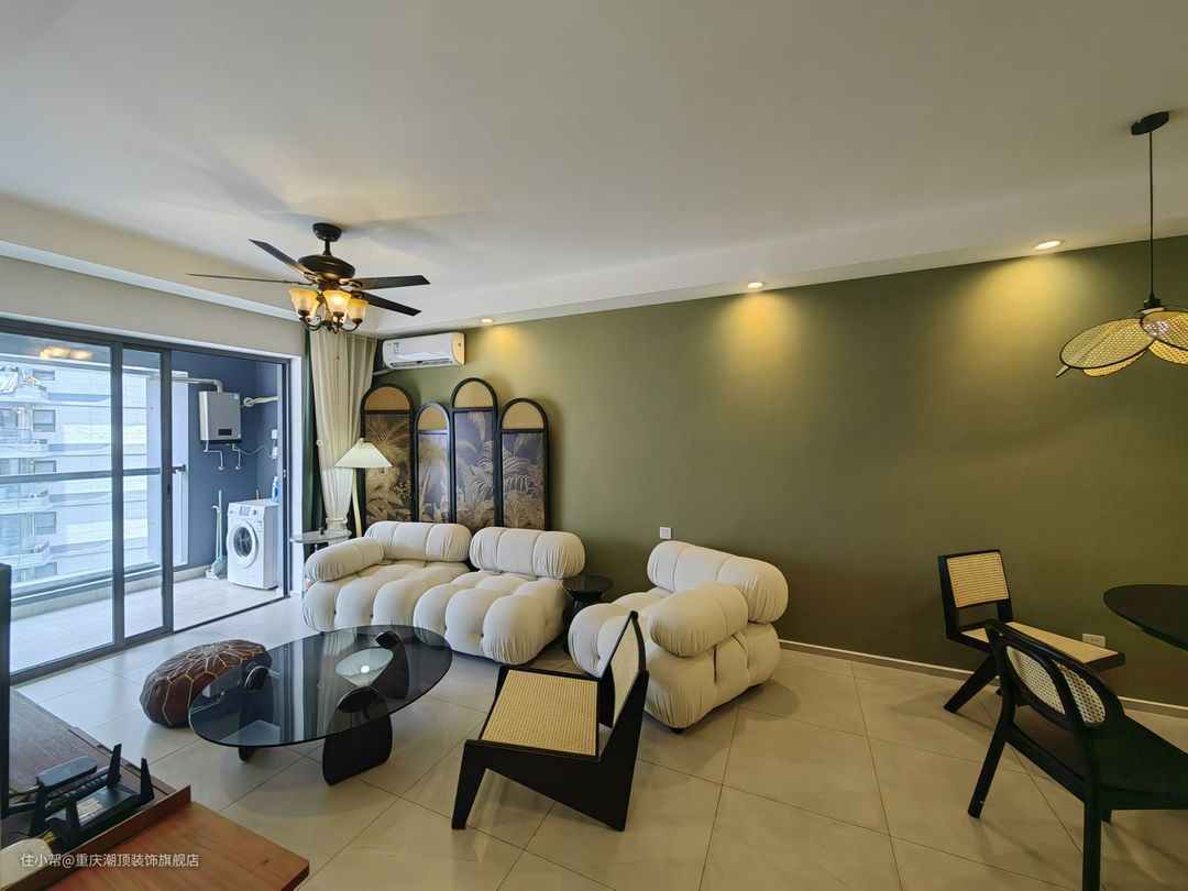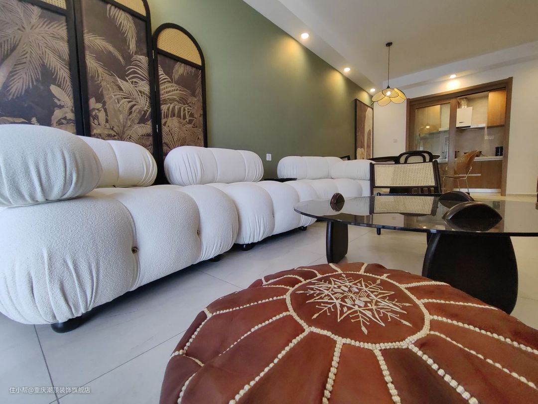 牛油果色+花纹美式装饰,更加显得空间具有电影感,而奶油系面包沙发给了整个空间现代视觉冲击
