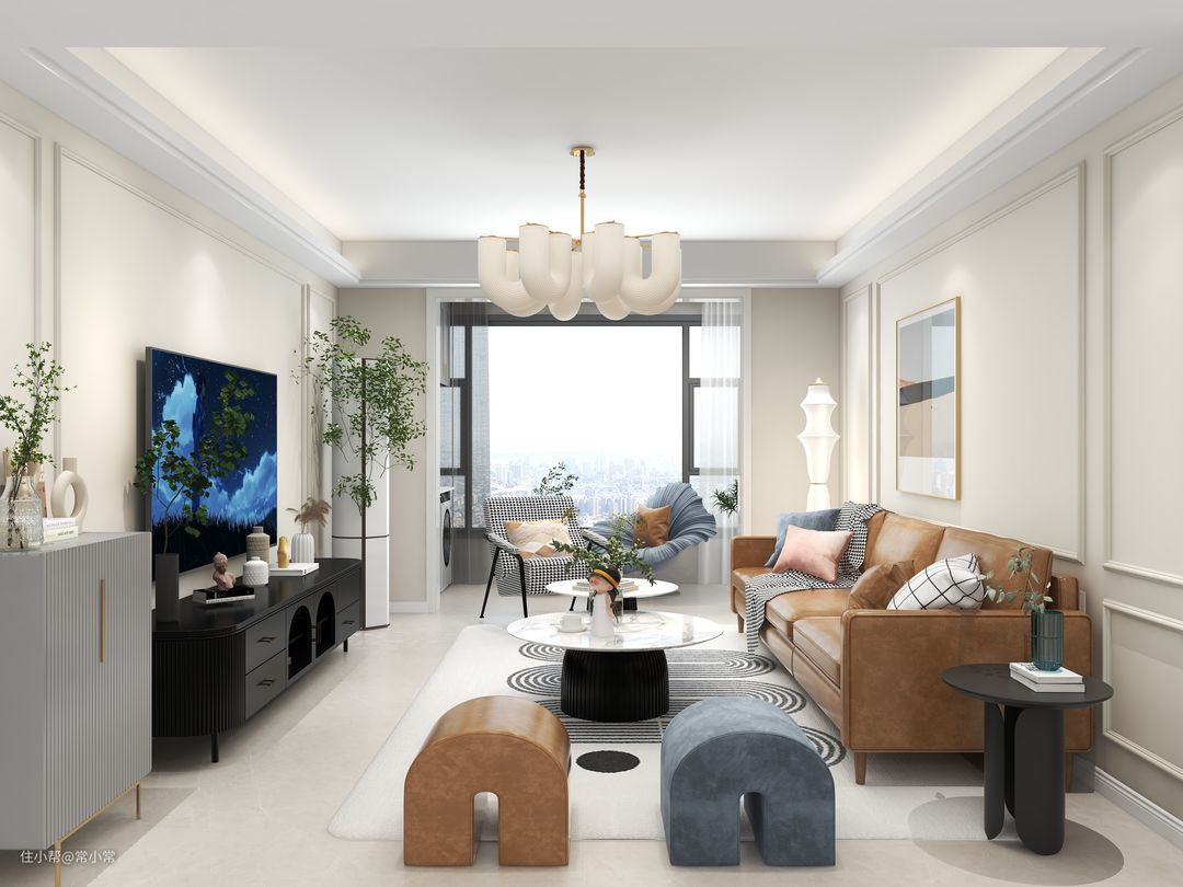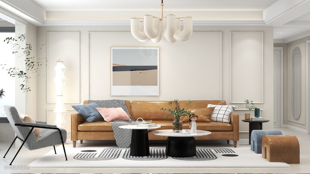 我们把浅杏色作为主色,搭配暖橙色的沙发和蓝色粉色的抱枕,活泼又温馨