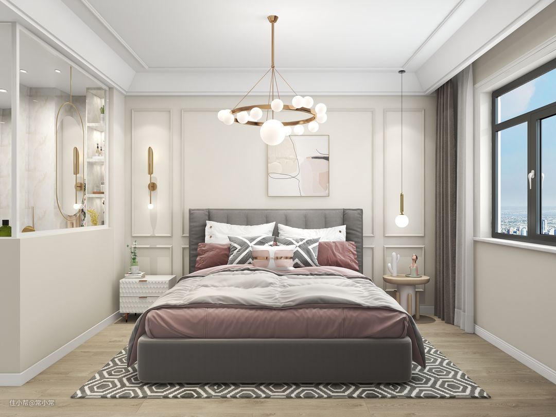 主卧室也是简洁的设计,线条勾勒,搭配和客厅一样的立邦魔术漆小羊皮系列“可可蛋奶”(可可蛋奶:NN0907-4)暖色系的墙面,温馨又耐看。