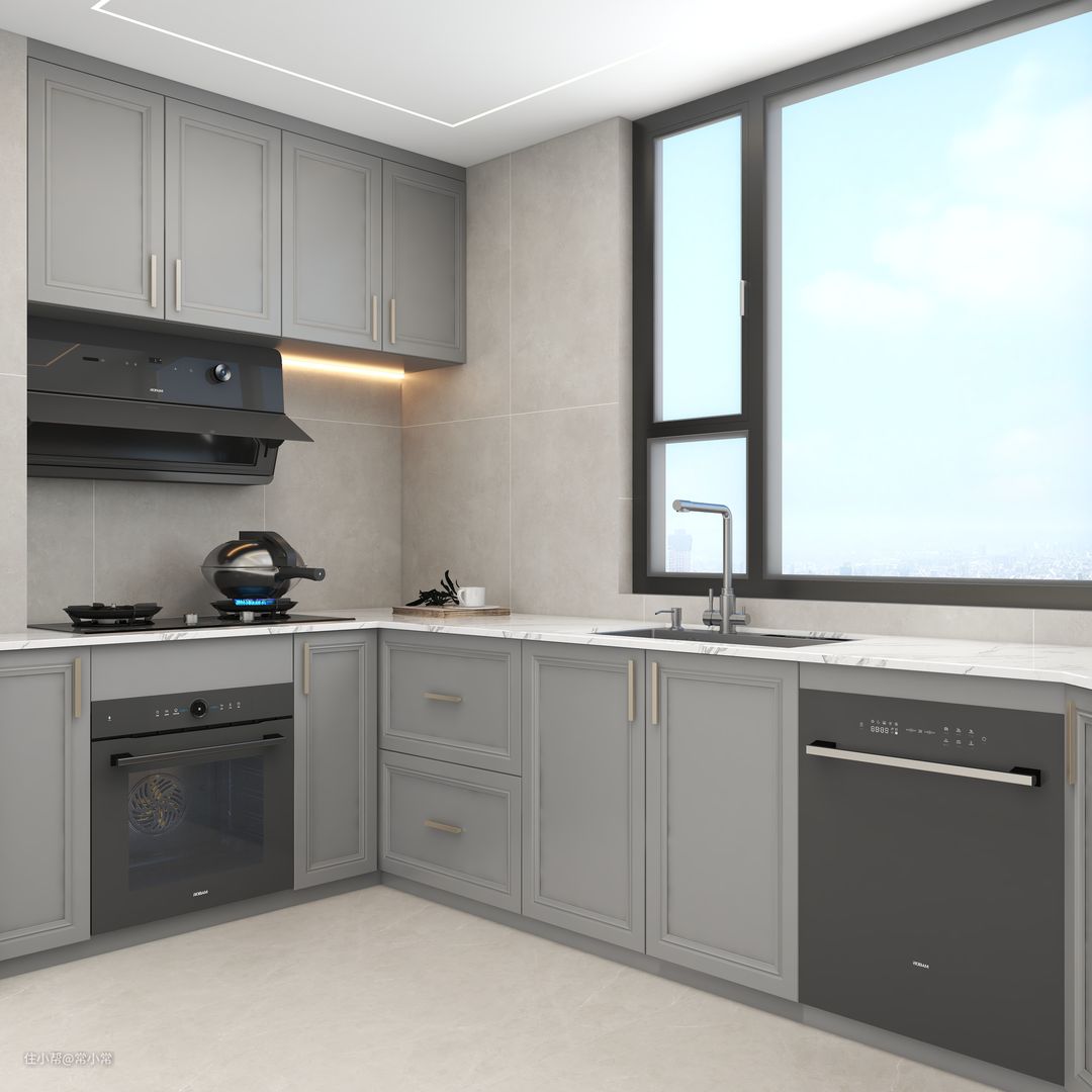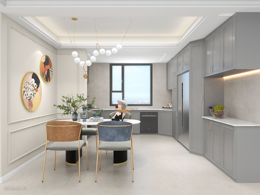整体以杏色为主调,搭配其他色彩软装。厨房采用莫兰迪蓝橱柜,色彩柔和清新,非常耐看。厨房和橱柜做一体设计,不加门,整体空间更大,适合孩子活动。 增加高柜设计,充分增加储物空间,满足储物需求。洗碗机和烤箱是业主点名要安排上的,业主喜欢烘焙,洗碗机可以更好的清洗烘焙用品#寻找1%的厨房