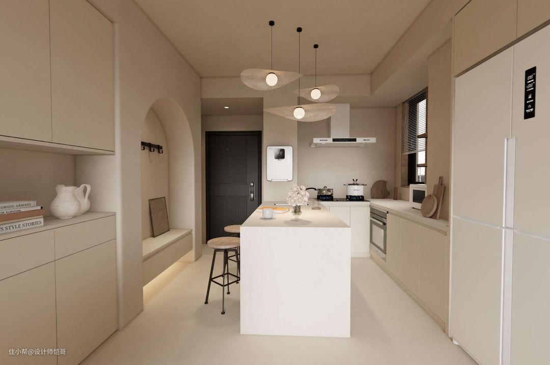 餐桌与厨房吧台一体的设计,更好的符合了空间形态,在任意角度都能绘制出温馨舒适的场景,也完美的再现了简约风格的独特魅力与静谧的艺术感。 开放式厨房很大一个好处就是把原有的餐厅空间扩大,显得更美观大气。 #寻找1%的厨房