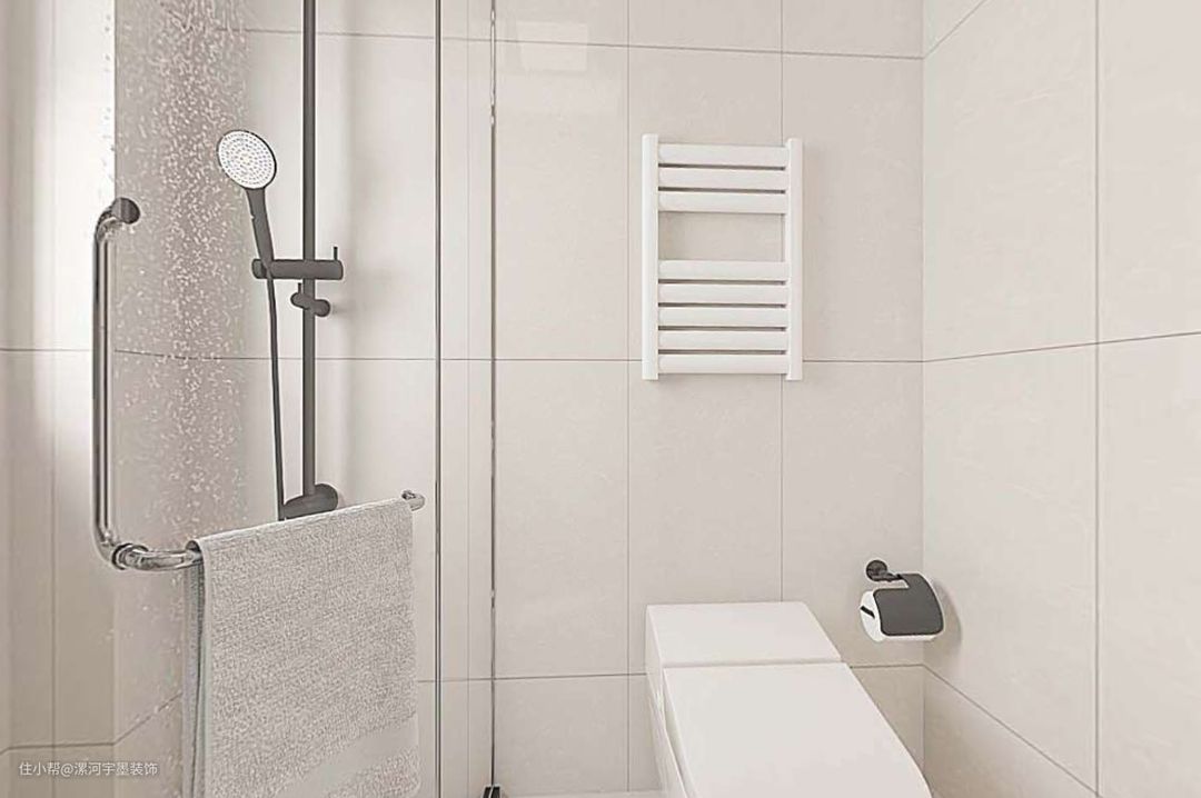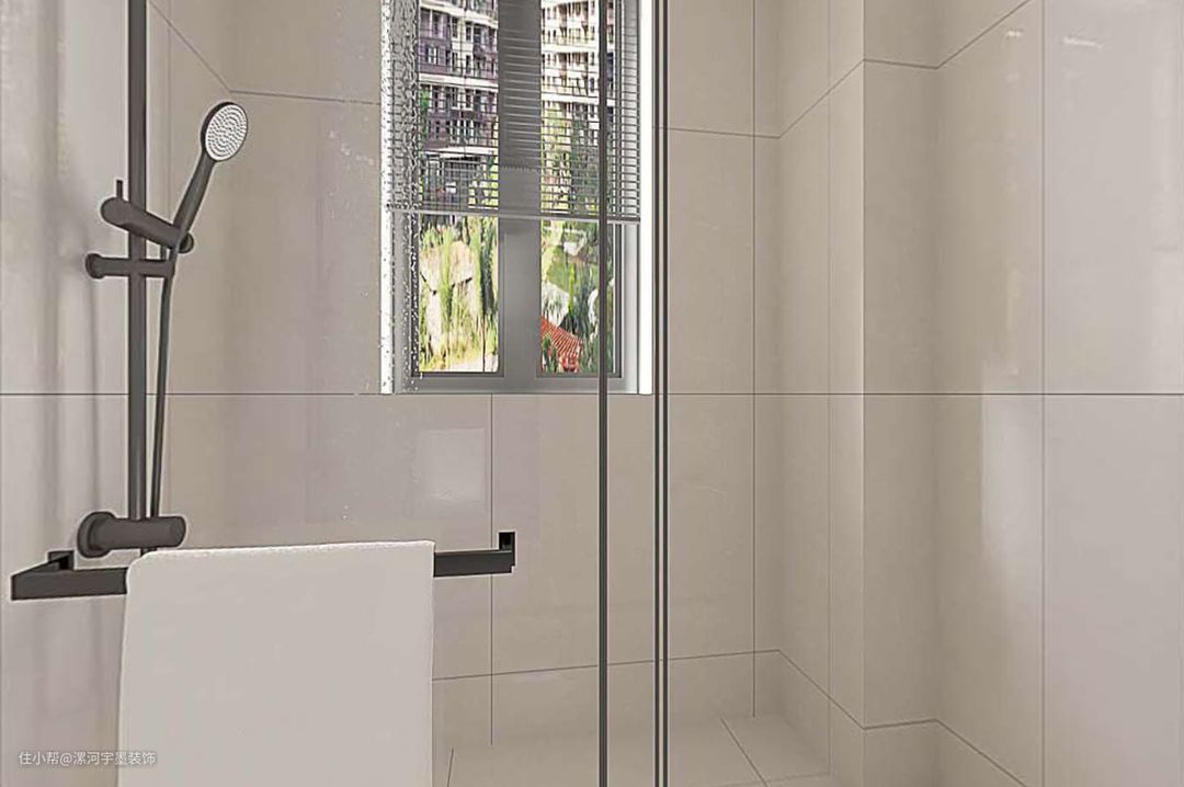 主卫根据卫生间尺寸与格局,设计钻石型淋浴房,瓷砖选用奶油色柔光砖400*800的尺寸,墙面竖向铺贴,墙地对缝,竖贴可以在视觉上起到拉伸整体高度的效果,让整个卫生间小空间显得更加大气,如果有条件的情况下,建议竖贴效果会更好。