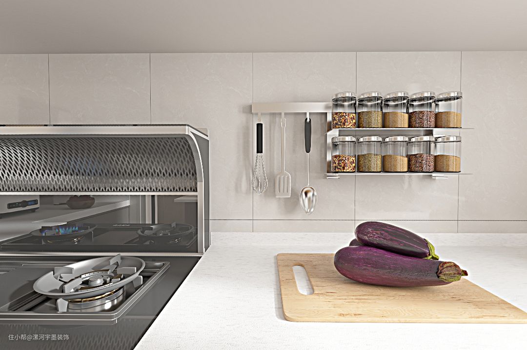 厨房本来的空间很小,原有冰箱位置多出来以后,设计成台面以及吊柜,将此处作为小家电操作区域非常不错,在操作动线上,洗切炒一定要按照顺序设计才方便后期的使用,还有橱柜配色的设计上,可以遵循上下同色或上浅下深原则,本案设计为地柜为浅灰色,吊柜设计和全屋定制柜门颜色一致,设计风格与全屋整体感统一,不会显得色彩杂乱