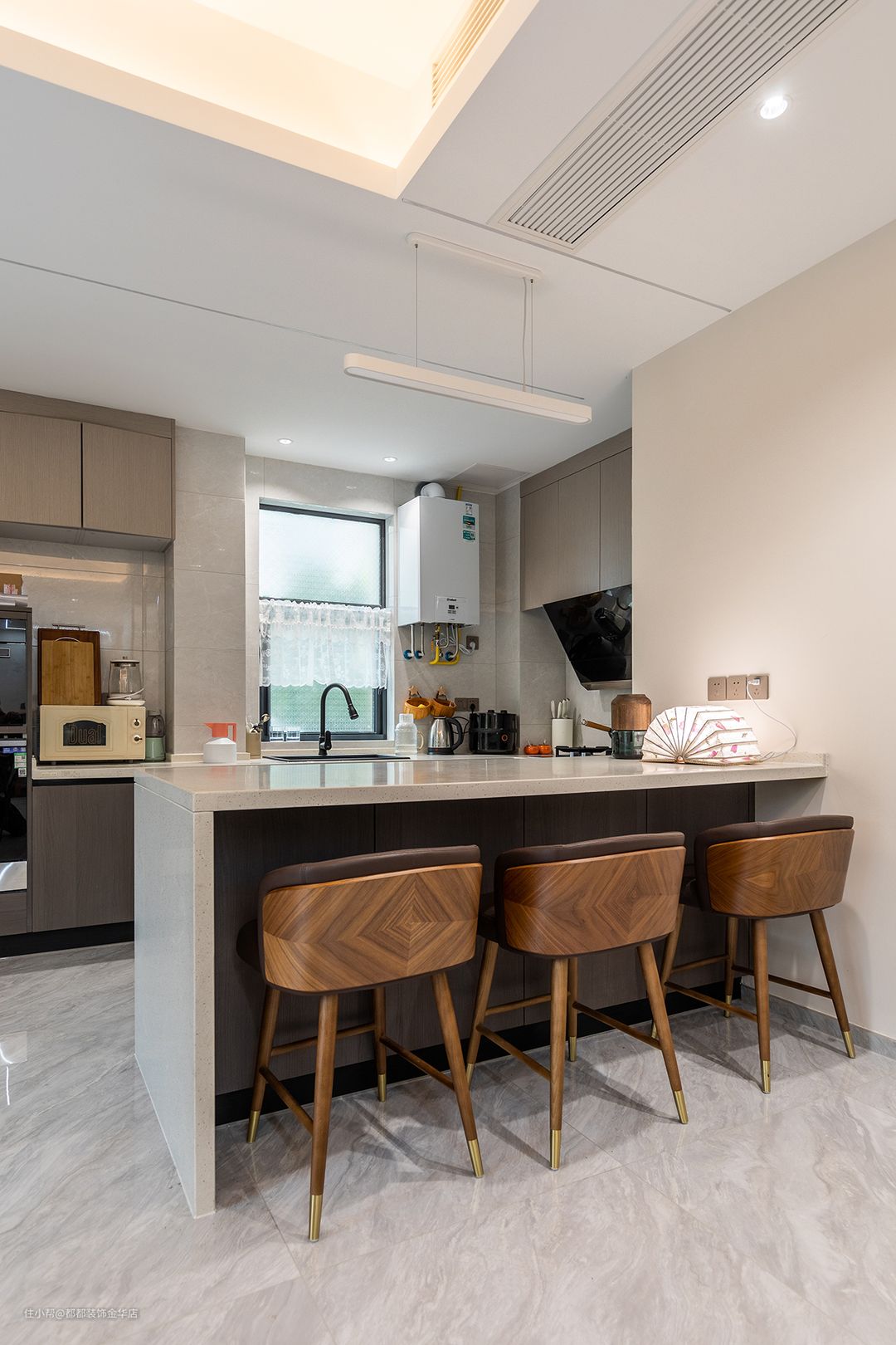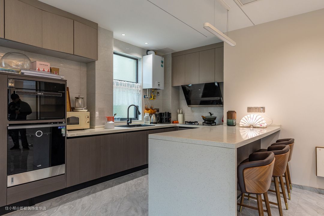 开放式厨房布局有强大的收纳功能,大容量的地柜和壁柜,很好的解决了厨房容易凌乱的问题,这个看似不起眼的1㎡吧台,却藏匿着关于生活的小确幸,能缓解操作空间不足的不便,更是促进情感沟通、提升家居情调和幸福感的必杀技。