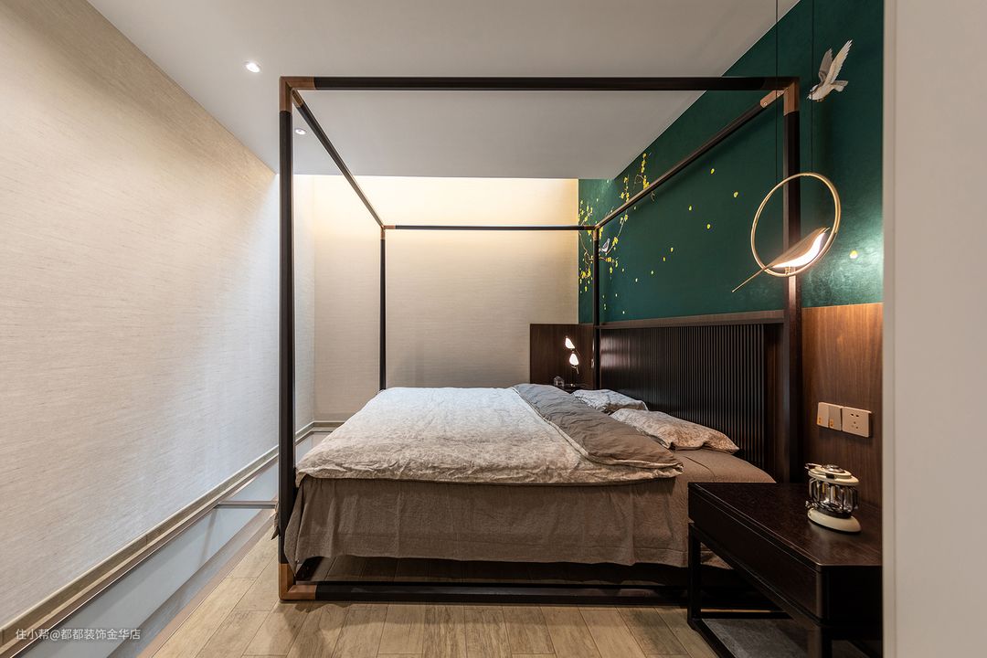 卧室的每个细节上流露着丝丝入扣的文化底蕴,墨绿色背景中点缀嫩黄腊梅花,犹如江南四季如春,马蹄溅起诗意,让春风一吹,便可闻到爱的淡淡花语。 圆形吊灯和喜鹊共同组成鹊上枝头的画面,有着好事将近的美好寓意,背景墙贵气的色泽与金属木制材质折射出优雅与文艺的气息。
